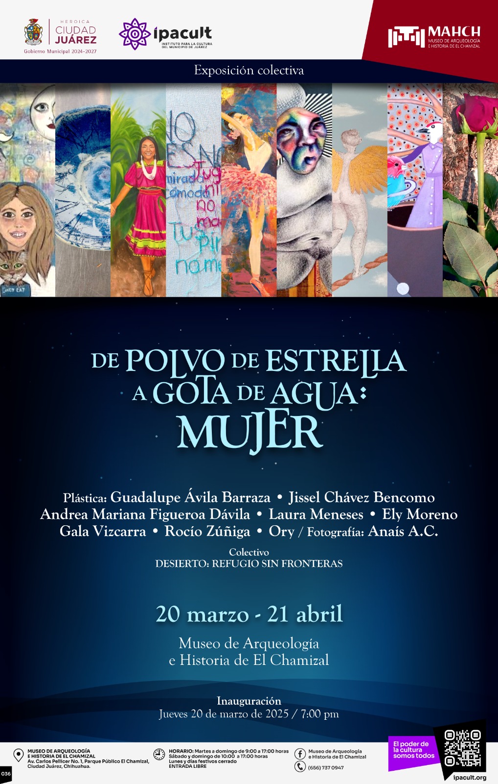 El Instituto para la Cultura del Municipio de Juárez (IPACULT) invita a la ciudadanía a la inauguración de la exposición de pintura, fotografía y cianotipia en cerámica “De polvo de estrellas a gota de agua: Mujer”, que tendrá lugar el jueves 20 de marzo a las 7:00 de la tarde en el Museo de Arqueología e Historia de El Chamizal (MAHCH).