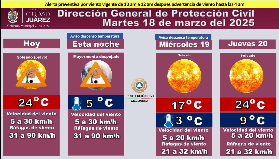 La Dirección General de Protección Civil informa que este martes 18 se mantiene una alerta preventiva por fuertes vientos, vigente de las 10:00 de la mañana a las 12:00 de la tarde, con una advertencia de viento hasta las 4:00 de la madrugada.