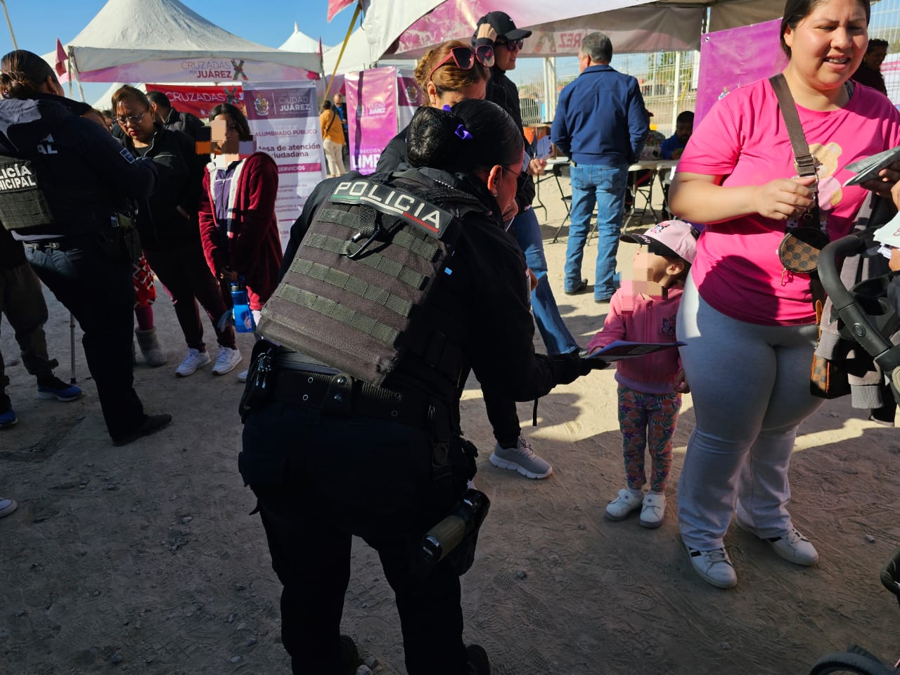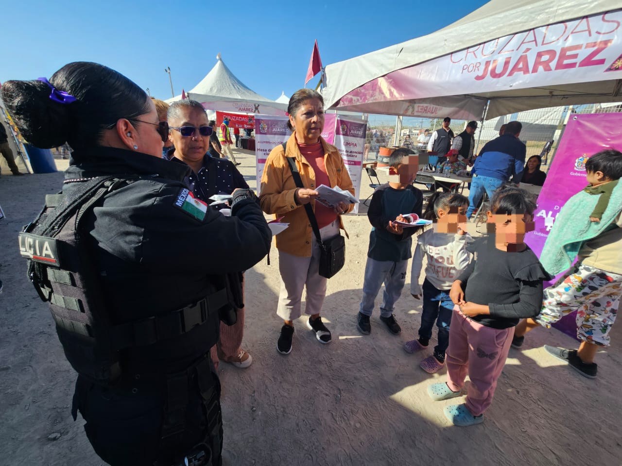Elementos de la Secretaría de Seguridad Pública Municipal participaron en la Cruzada por Juárez que se lleva a cabo en la colonia Riveras del Bravo.