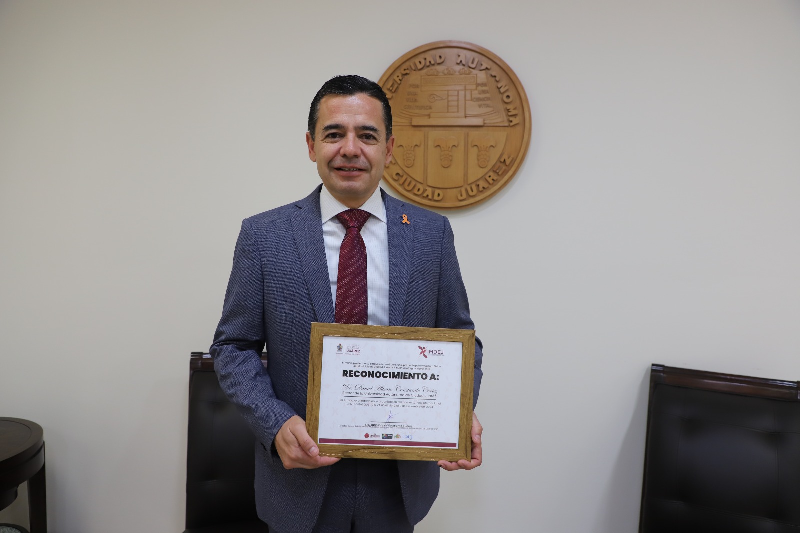 Este día, el director del Instituto Municipal del Deporte y Cultura Física de Juárez (IMDEJ), Juan Escalante, entregó un reconocimiento al rector de la Universidad Autónoma de Ciudad Juárez, Daniel Alberto Constandse Cortez.