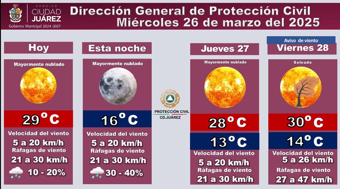 La Dirección General de Protección Civil informó el pronóstico del clima para los próximos días, destacando cielos mayormente nublados y un aviso de viento para el viernes 28 de marzo.