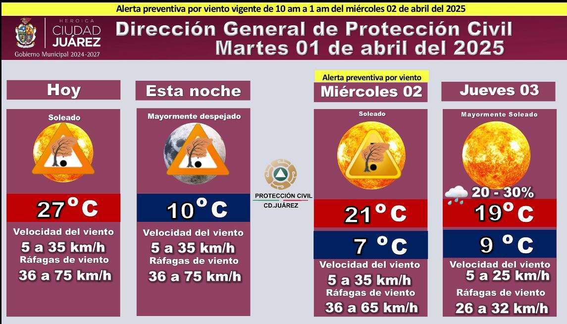 La Dirección General de Protección Civil emitió una alerta preventiva por vientos fuertes vigente desde las 10:00 de la mañana hasta la 1:00 de la madrugada del miércoles 2 de abril.