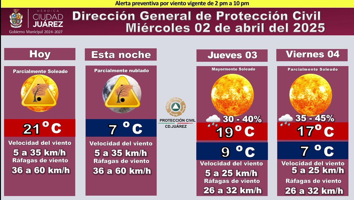 La Dirección General de Protección Civil informa que continúa vigente la alerta preventiva por vientos para este miércoles 02 de abril de 2025, con una duración estimada de 2:00 p.m. a 10:00 p.m.