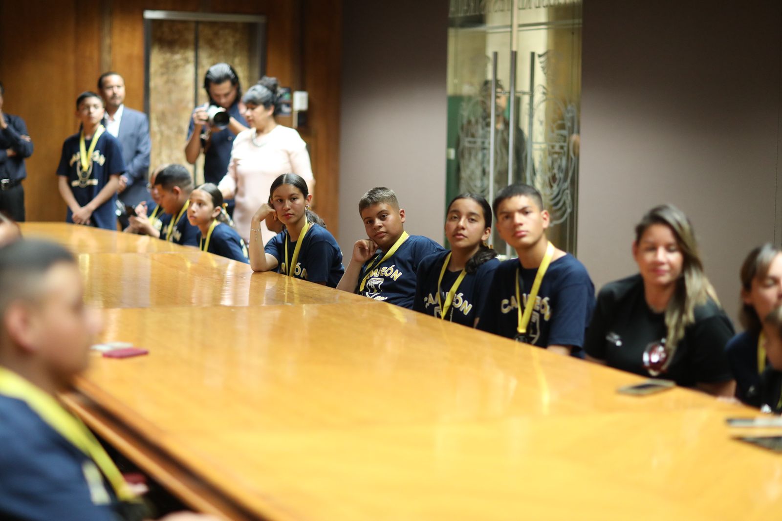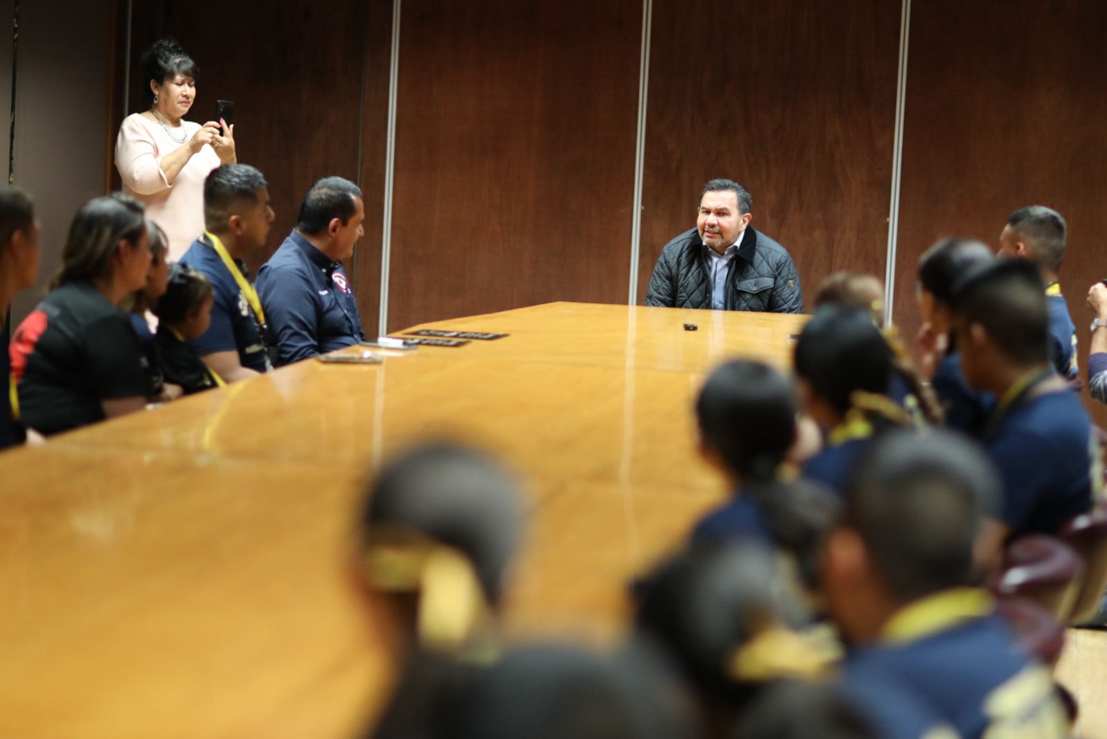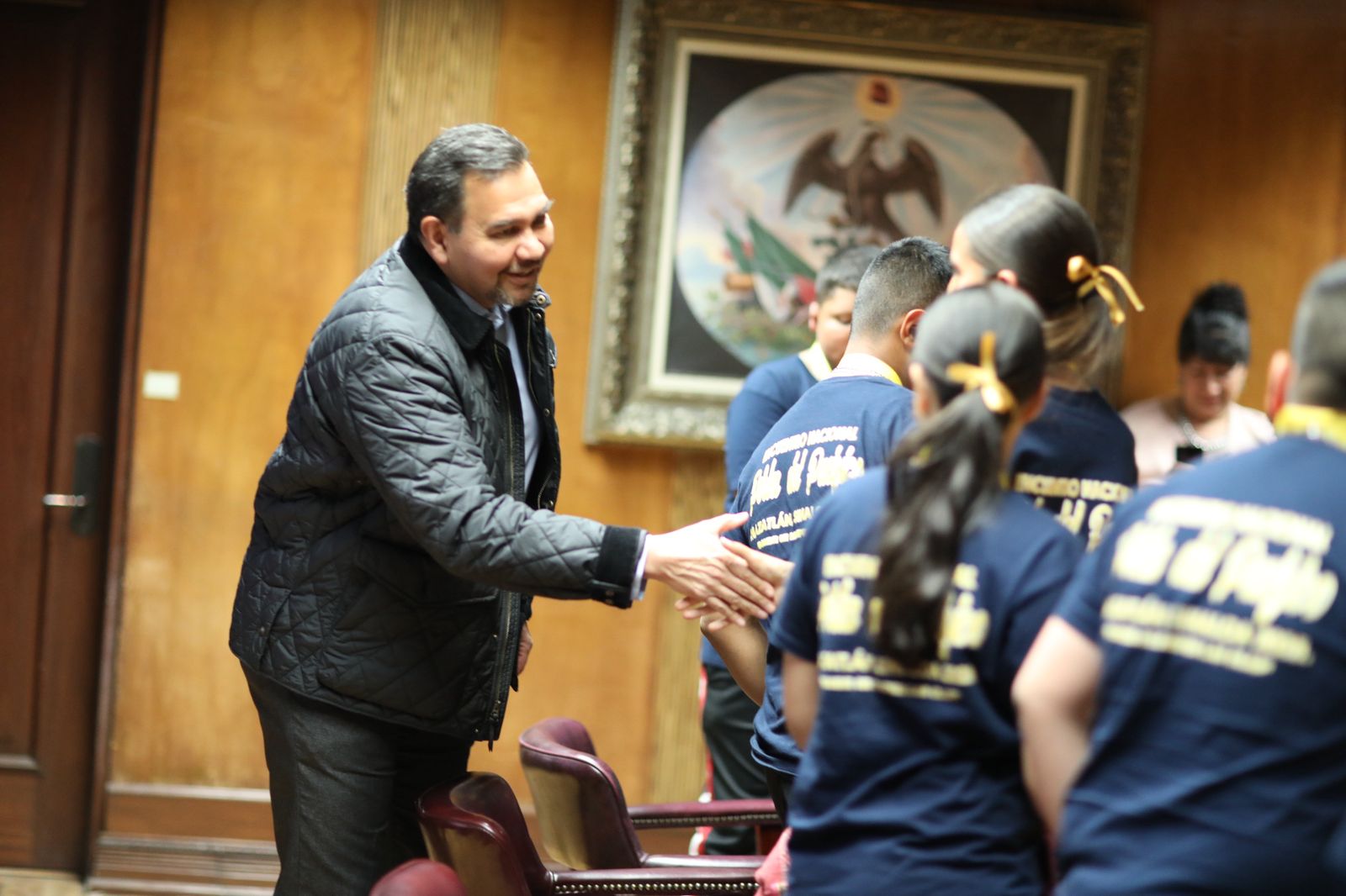 El Presidente Municipal, Cruz Pérez Cuéllar recibió esta tarde la visita de las y los alumnos de la Escuela Secundaria Federal número 18, quienes por segundo año consecutivo obtuvieron el primer lugar en el concurso nacional de Bandas de Guerra.