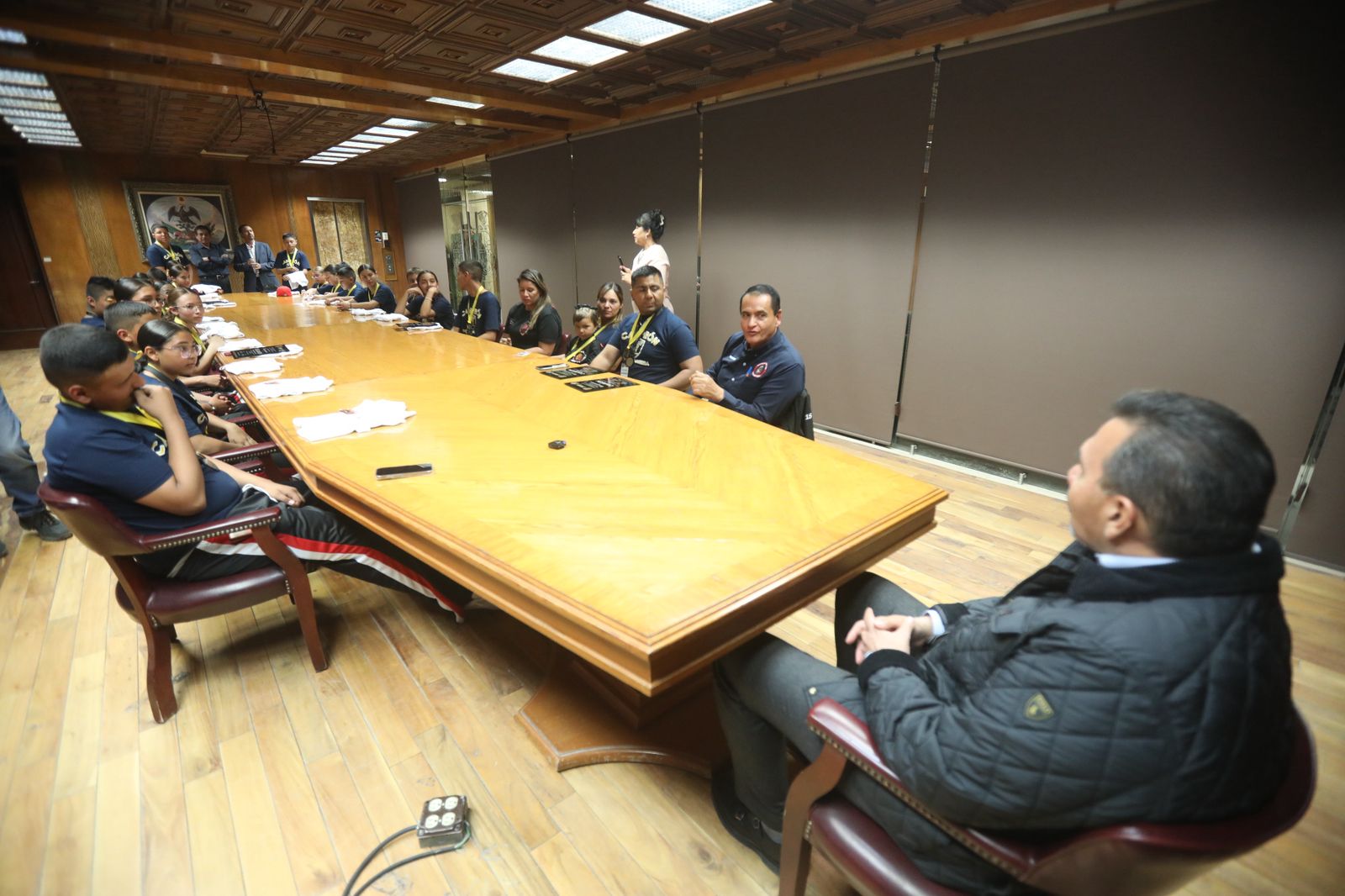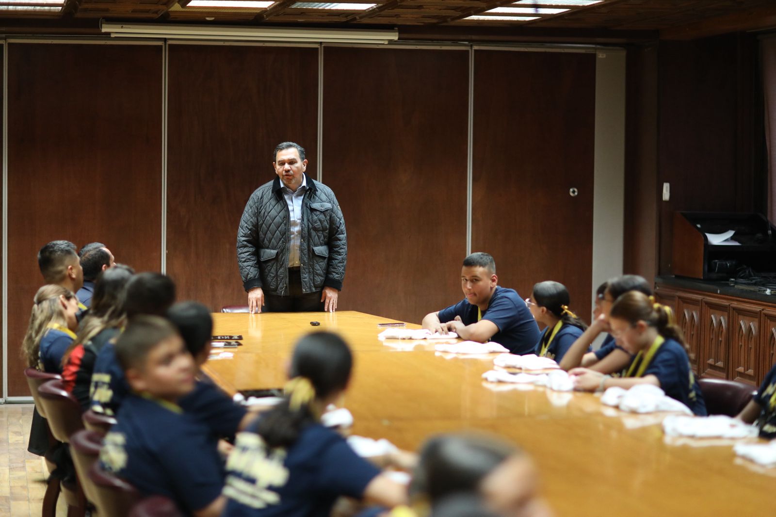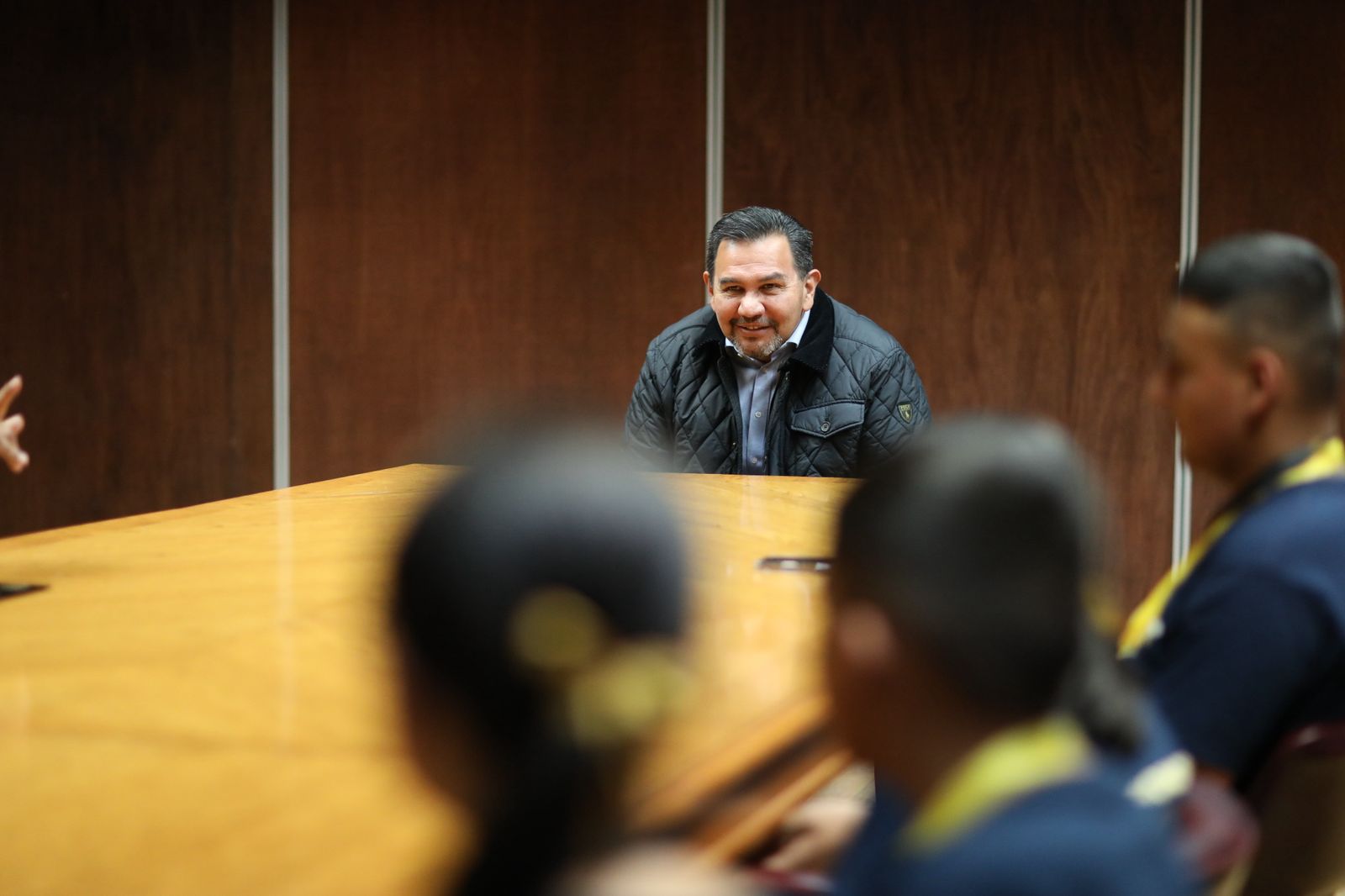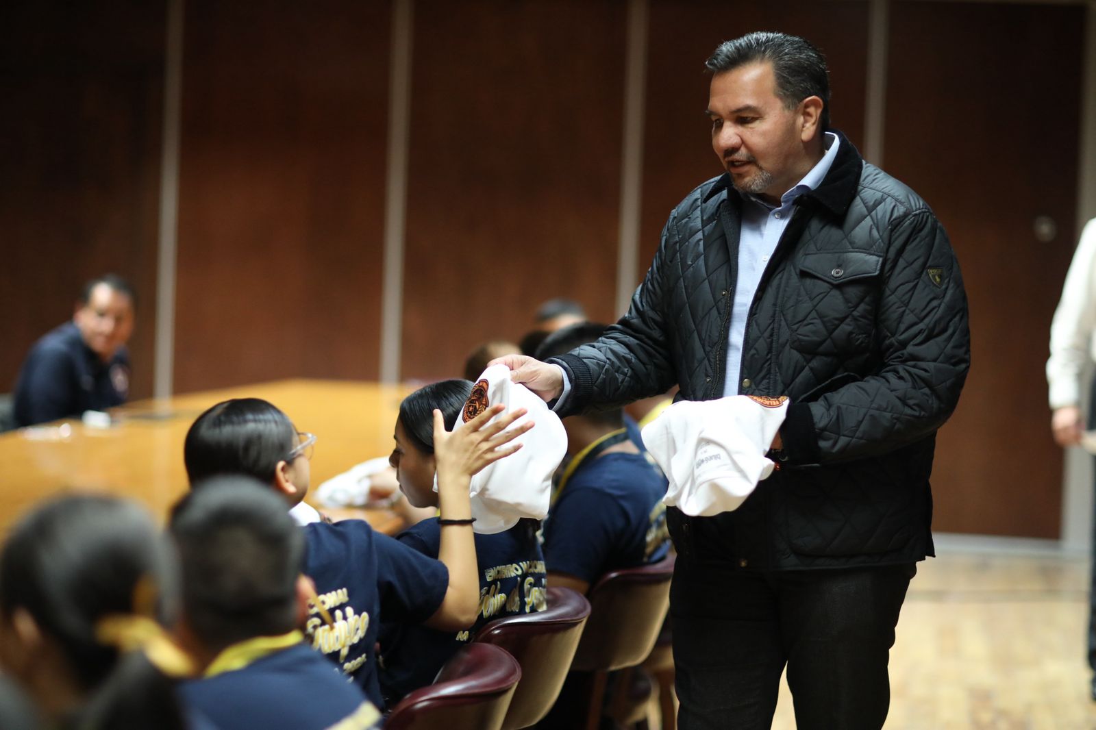 El Presidente Municipal, Cruz Pérez Cuéllar recibió esta tarde la visita de las y los alumnos de la Escuela Secundaria Federal número 18, quienes por segundo año consecutivo obtuvieron el primer lugar en el concurso nacional de Bandas de Guerra.