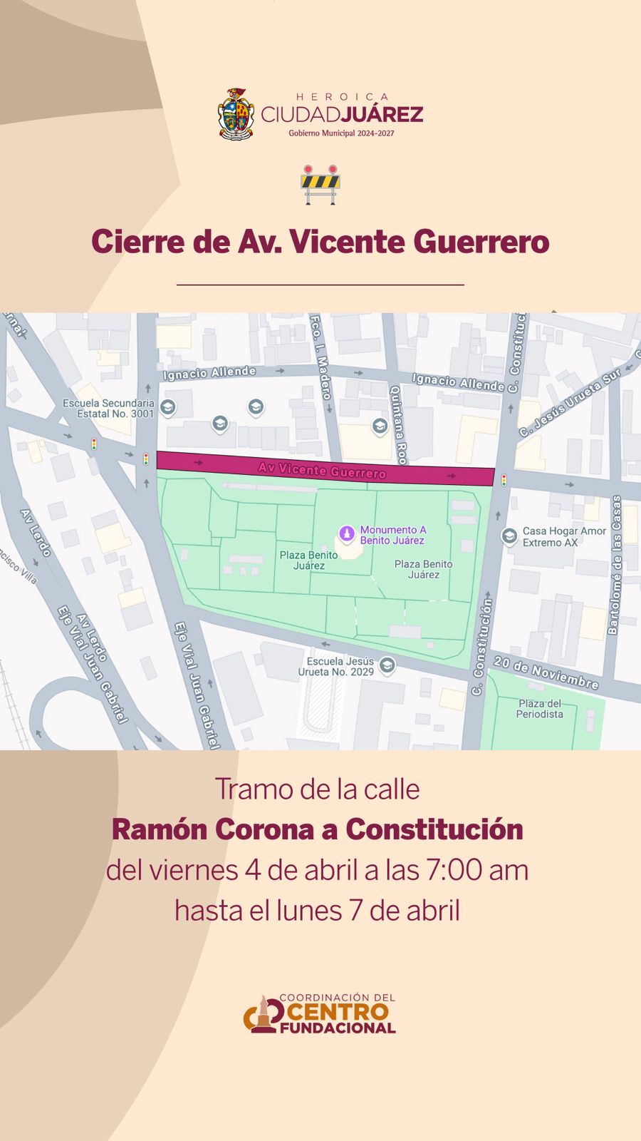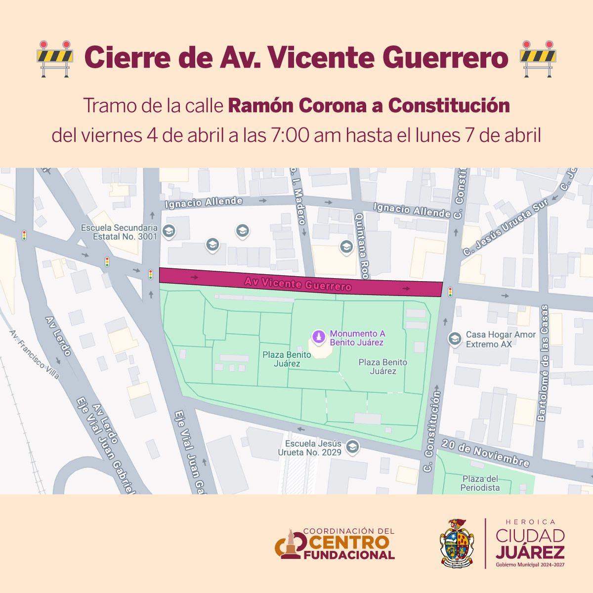 Uno de los cierres se realiza en la avenida Vicente Guerrero, en un tramo de la calle Ramón Corona a Constitución, enfrente del Monumento a Benito Juárez, por lo que no hay acceso por las vías Francisco I. Madero y Quintana Roo, ya que ahí se estará llevando a cabo la competencia de freestyle FMS Caribe, a partir de las 6:00 y hasta las 23:00 horas.