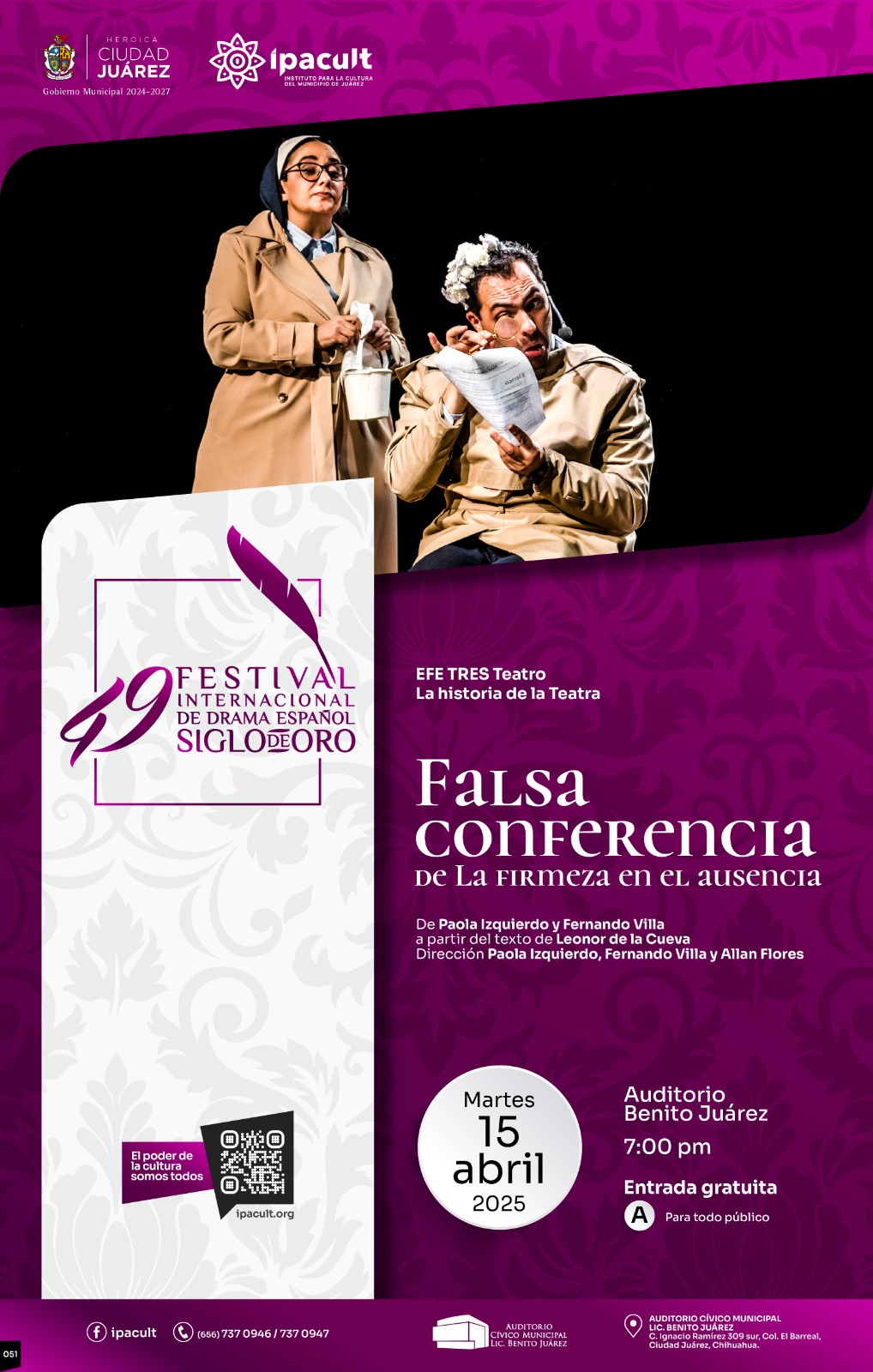 El Instituto para la Cultura del Municipio de Juárez (IPACULT) invita a la ciudadanía a la presentación de la obra “Falsa conferencia, de la firmeza en el ausencia”, este martes 15 de abril a las 7:00 de la tarde, en el Auditorio Cívico Municipal Benito Juárez y que forma parte de la edición 49 del Festival Internacional de Drama Español del Siglo de Oro.