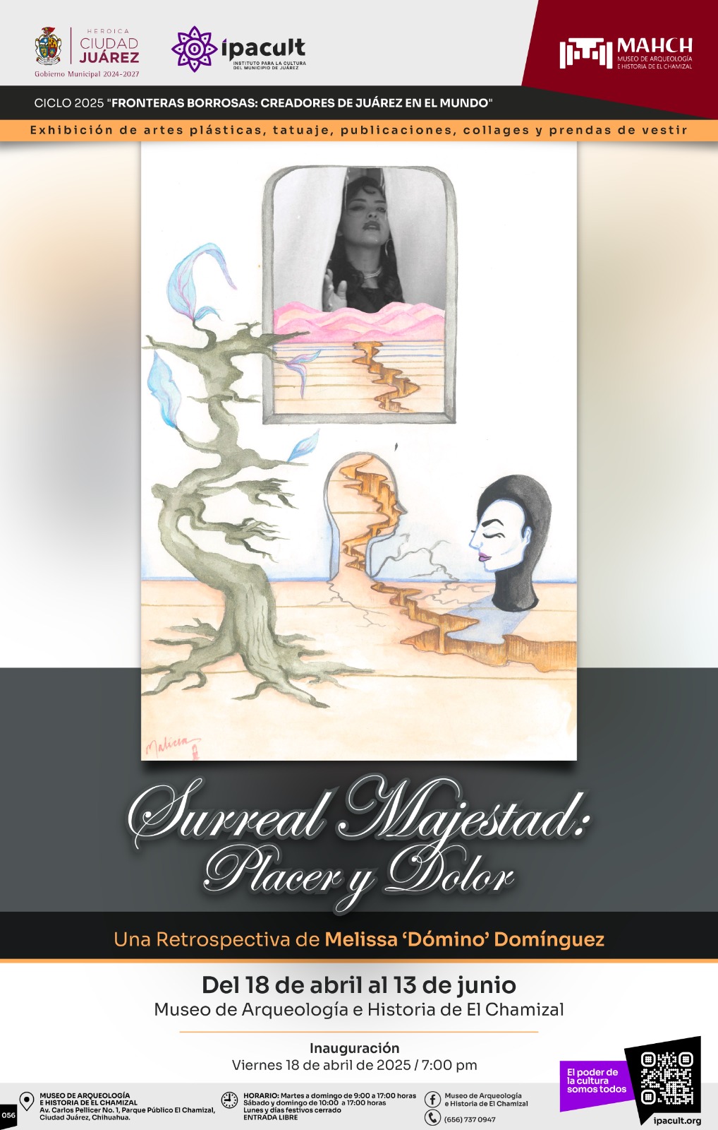 El Instituto para la Cultura del Municipio de Juárez (IPACULT) invita a la ciudadanía a la inauguración de la muestra “Surreal Majestad: Placer y Dolor”, una exposición multidisciplinaria de la artista Melissa "Domino" Domínguez, este viernes 18 de abril a las 7:00 de la tarde en el Museo de Arqueología e Historia de El Chamizal (MAHCH).