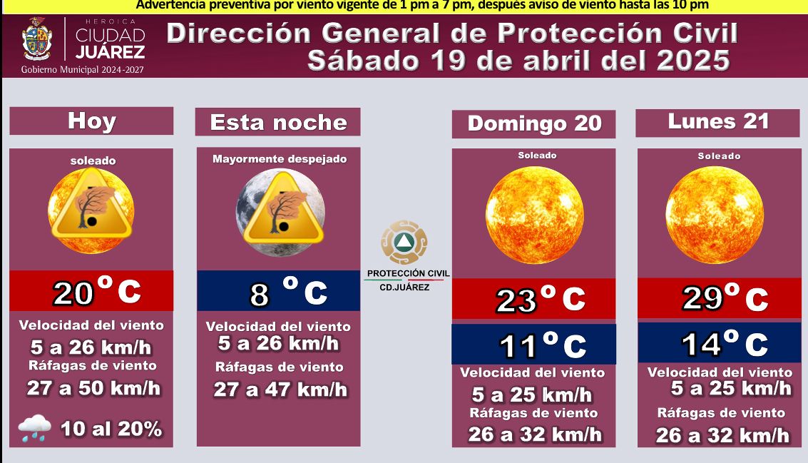 La Dirección General de Protección Civil de Ciudad Juárez emitió el pronóstico del clima correspondiente a este sábado.