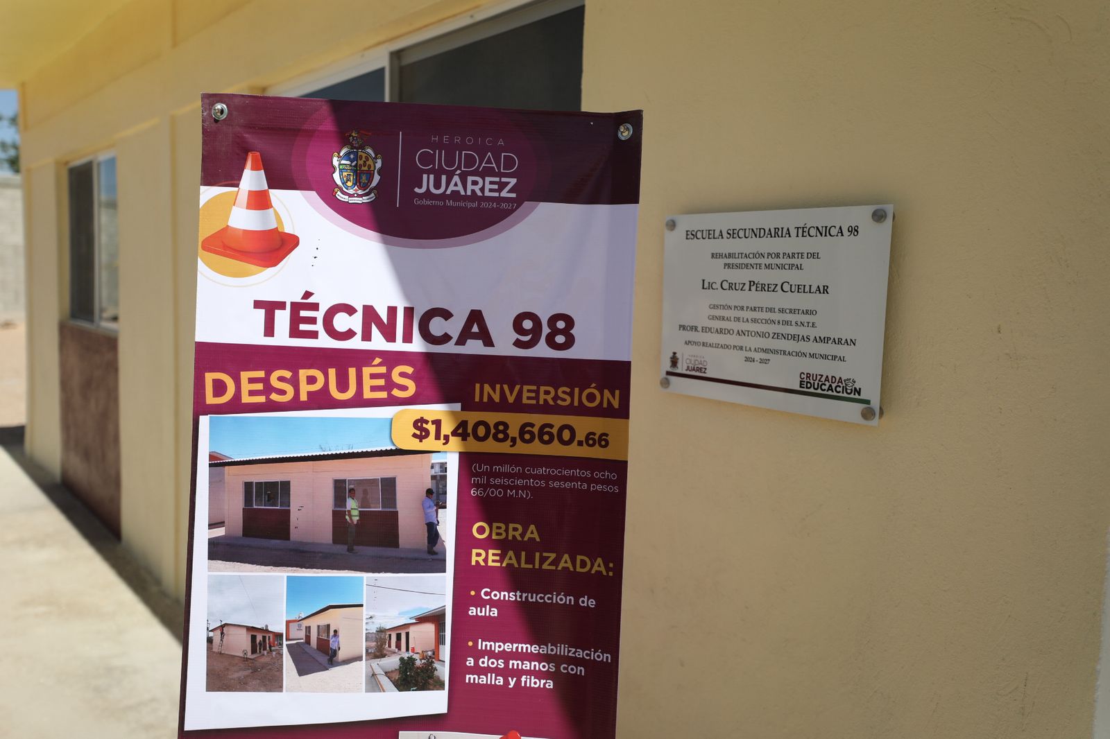 El Presidente Municipal, Cruz Pérez Cuéllar, entregó este día las obras de rehabilitación de la Escuela Secundaria Técnica 98, en donde, además de la impermeabilización a dos manos con malla y fibra, se construyó un aula.