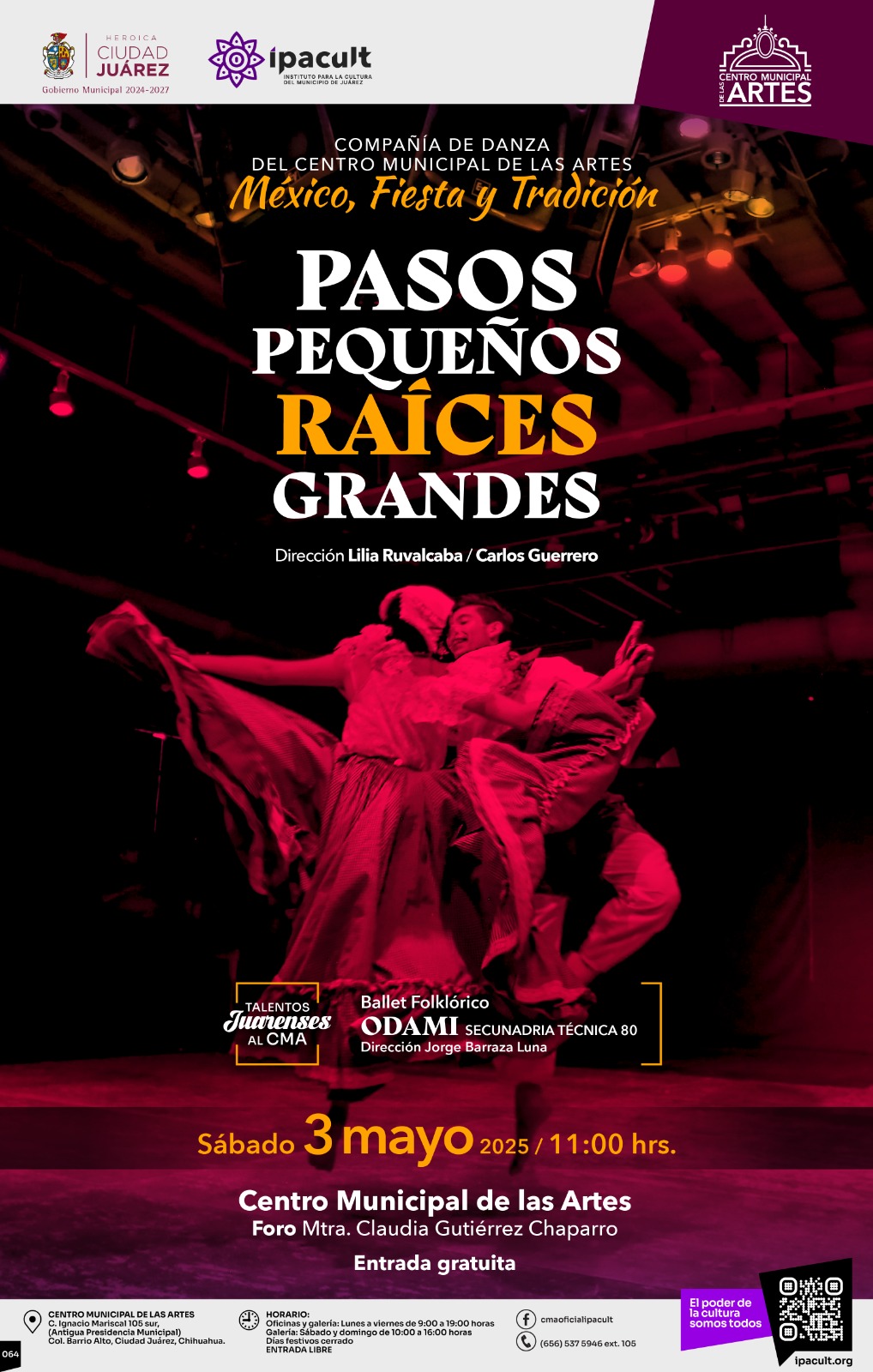 El Instituto para la Cultura del Municipio de Juárez (IPACULT) hace una cordial invitación a la comunidad juarense para disfrutar del espectáculo de danza “Pequeños pasos, Raíces grandes”, que se presentará de manera gratuita este sábado 3 de mayo a las 11:00 de la mañana en el Centro Municipal de las Artes (CMA).