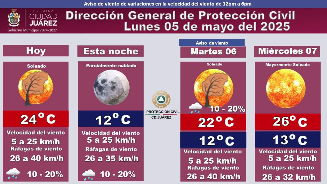 La Dirección General de Protección Civil informa que este lunes 5 de mayo se presenta un dÃa soleado en Ciudad Juárez, con una temperatura máxima de 24 °C y mÃnima de 12 °C. Se esperan vientos con velocidad entre 5 y 25 kilómetros por hora y ráfagas que podrÃan alcanzar los 40 kilómetros por hora.