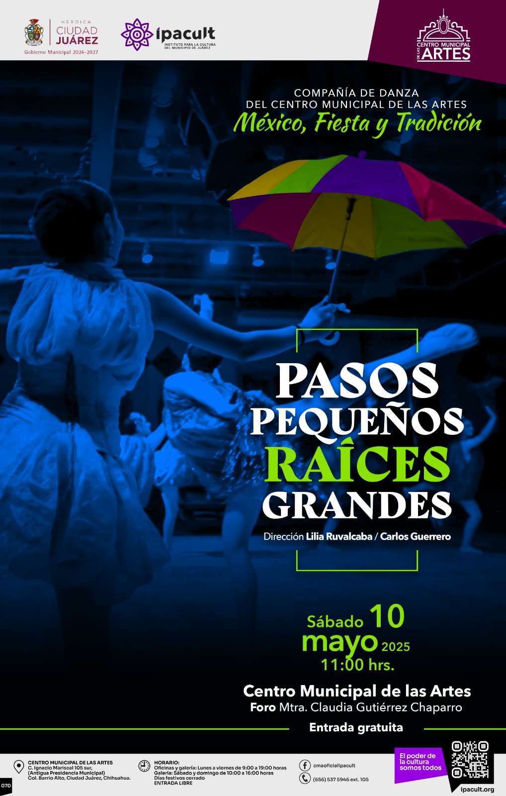 Este sábado 10 de mayo, la comunidad juarense tiene una cita con el arte y la tradición en el Centro Municipal de las Artes (CMA), donde se presentará de manera gratuita el espectáculo de danza “Pasos pequeños, Raíces grandes”, a las 11:00 de la mañana.