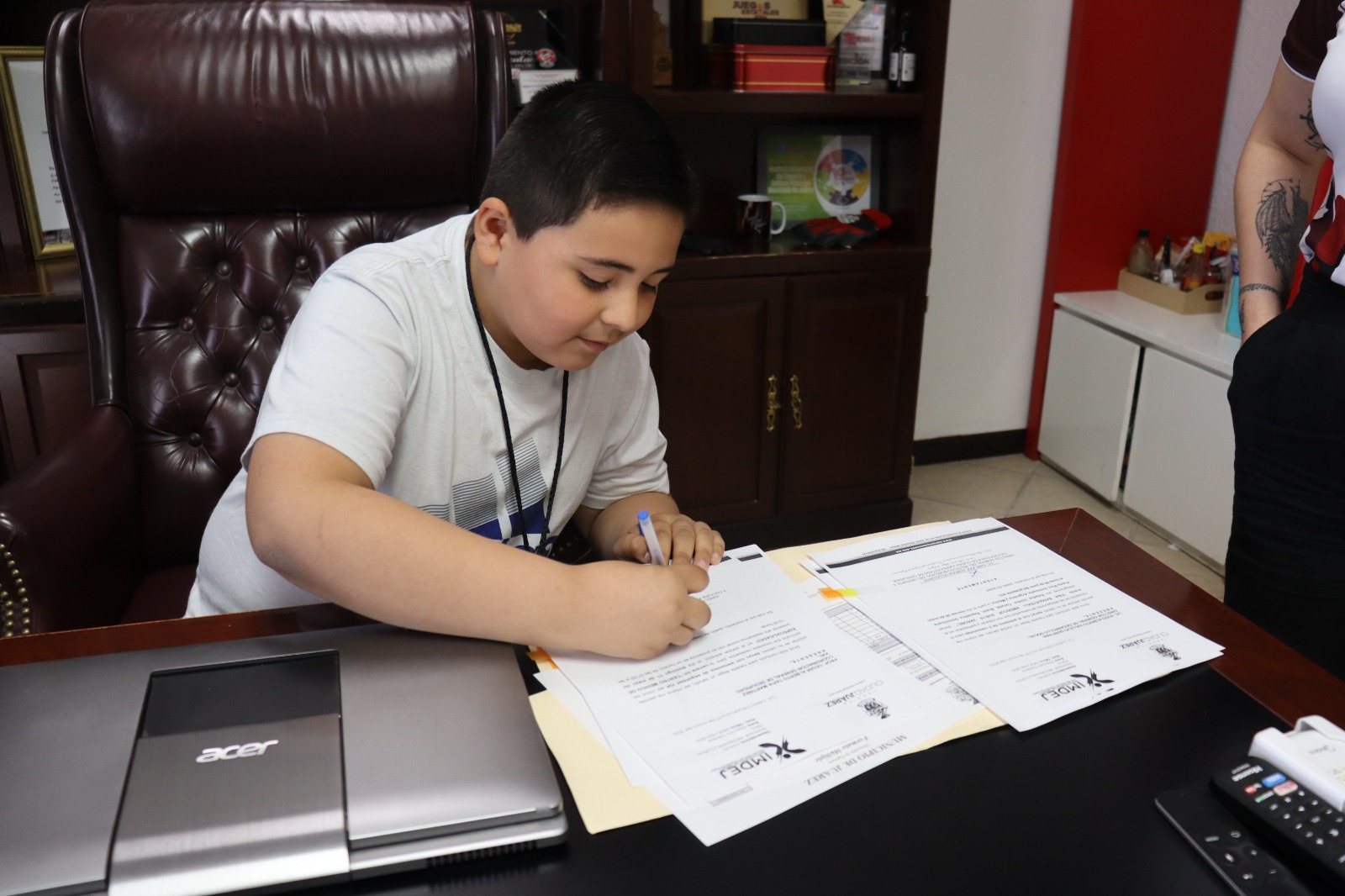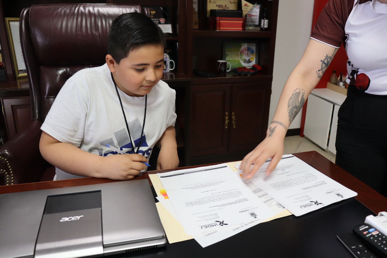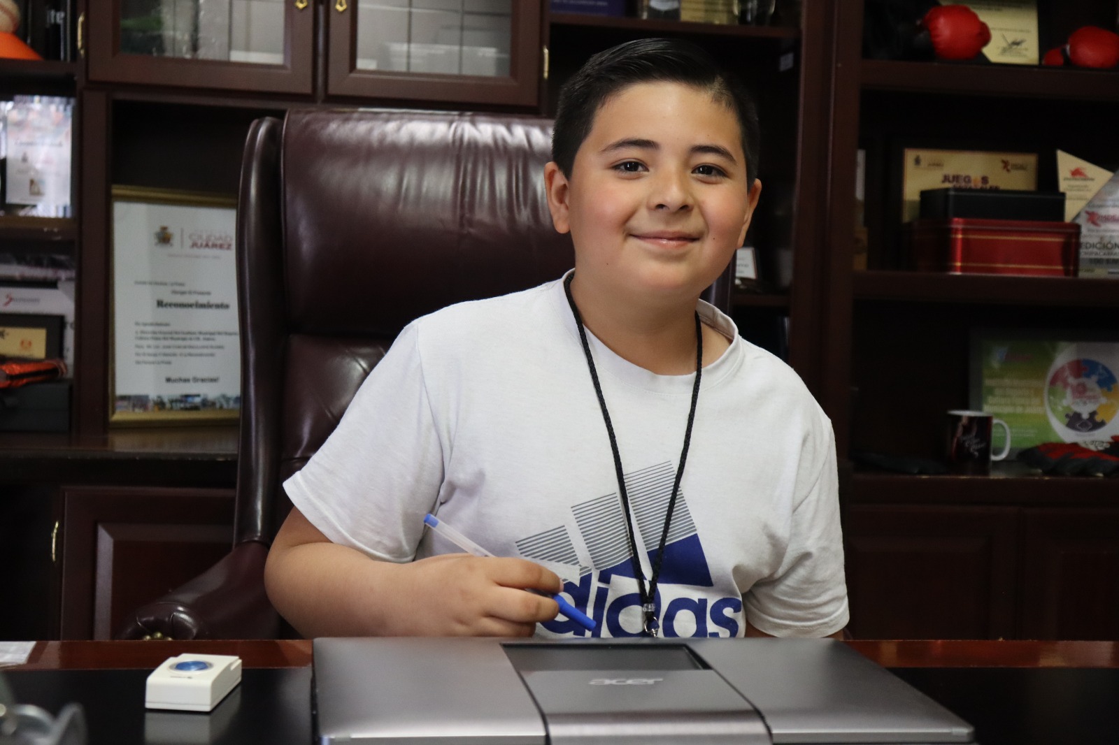 En el marco de las actividades por el Día de la Niñez, el niño Iván José Almeida Villalobos, de 10 años de edad, fungió hoy como director del Instituto Municipal del Deporte y Cultura Física de Juárez (IMDEJ).