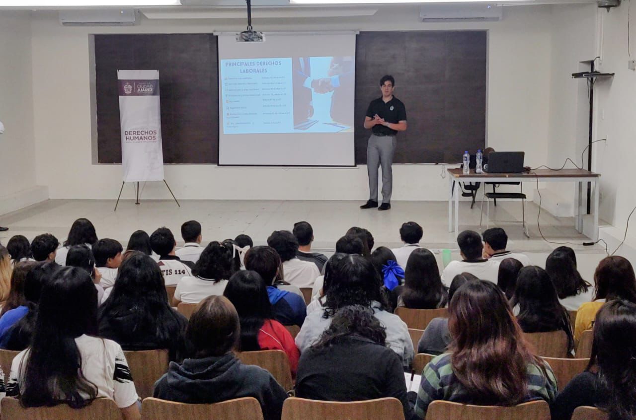 Personal de la Dirección de Derechos Humanos acudió al Centro de Bachillerato Tecnológico Industrial y de Servicios (CBTIS) 114 para promover los derechos laborales entre jóvenes estudiantes.