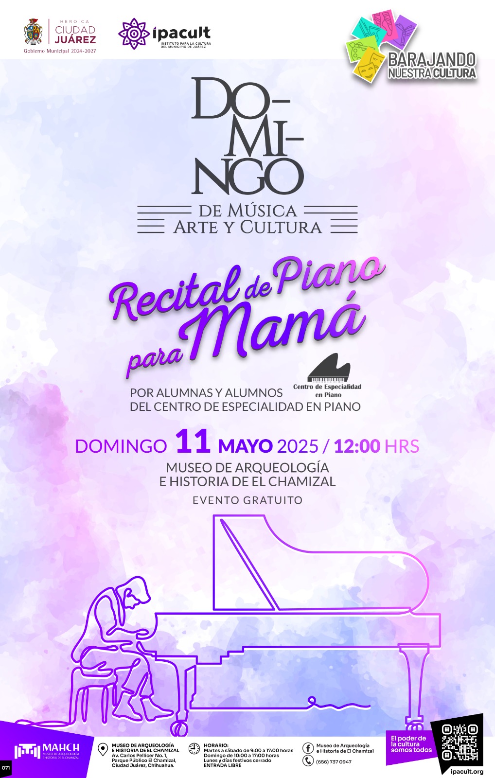El Instituto para la Cultura del Municipio de Juárez (IPACULT) extiende una cordial invitación a toda la comunidad para asistir al recital gratuito “Do-Mi-ngo de Música, Arte y Cultura”, que se llevará a cabo este domingo 11 de mayo a las 12:00 del mediodía, en las instalaciones del Museo de Arqueología e Historia de El Chamizal (MAHCH).