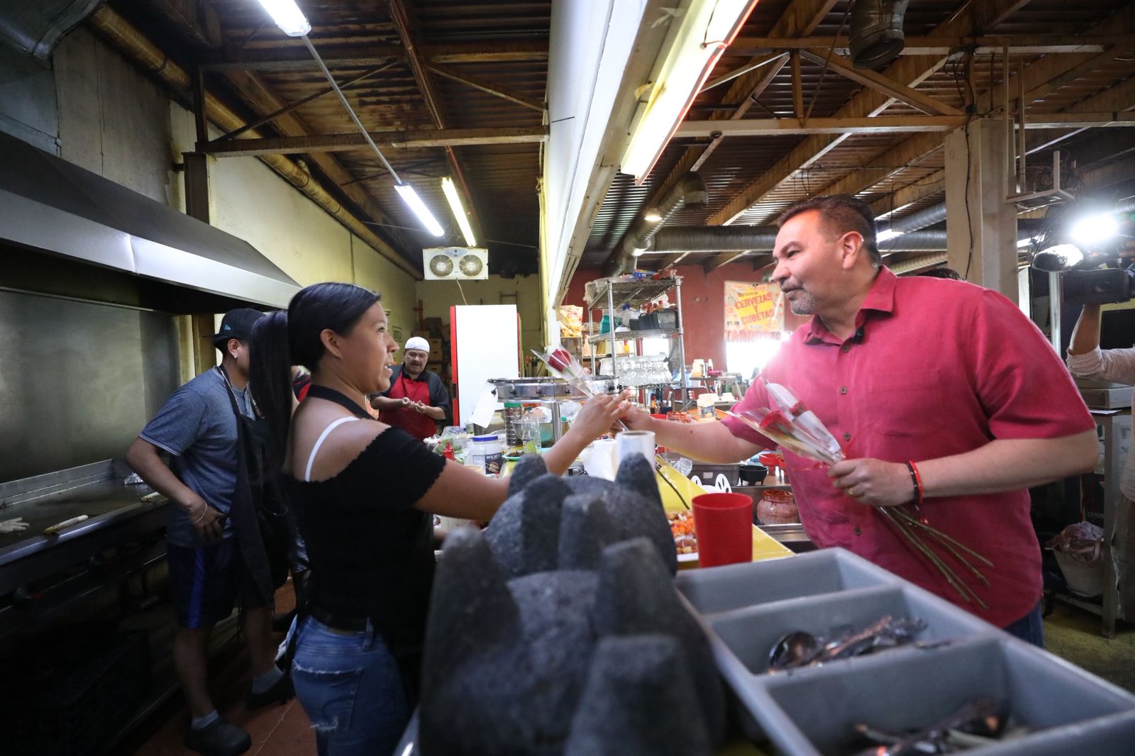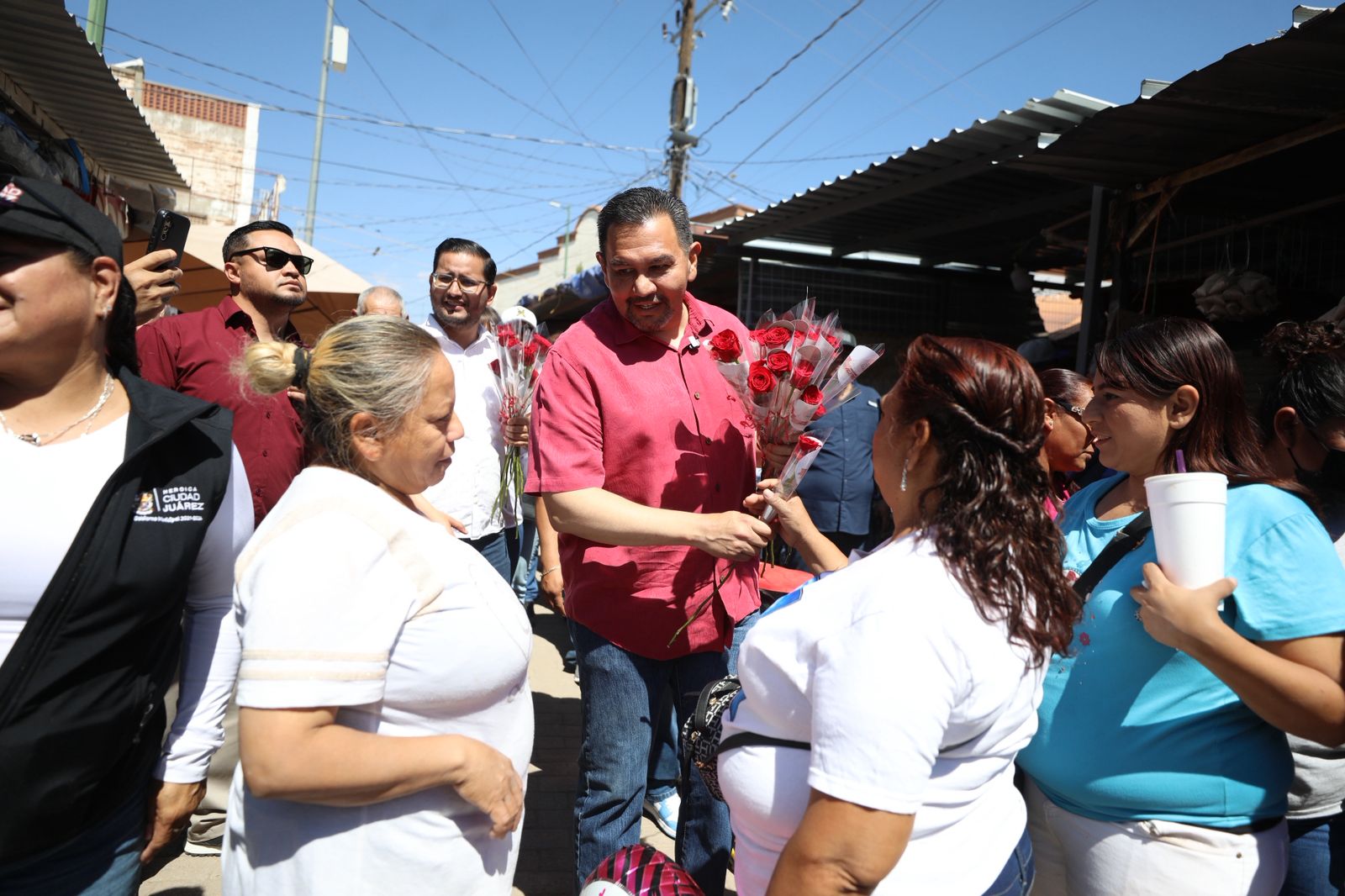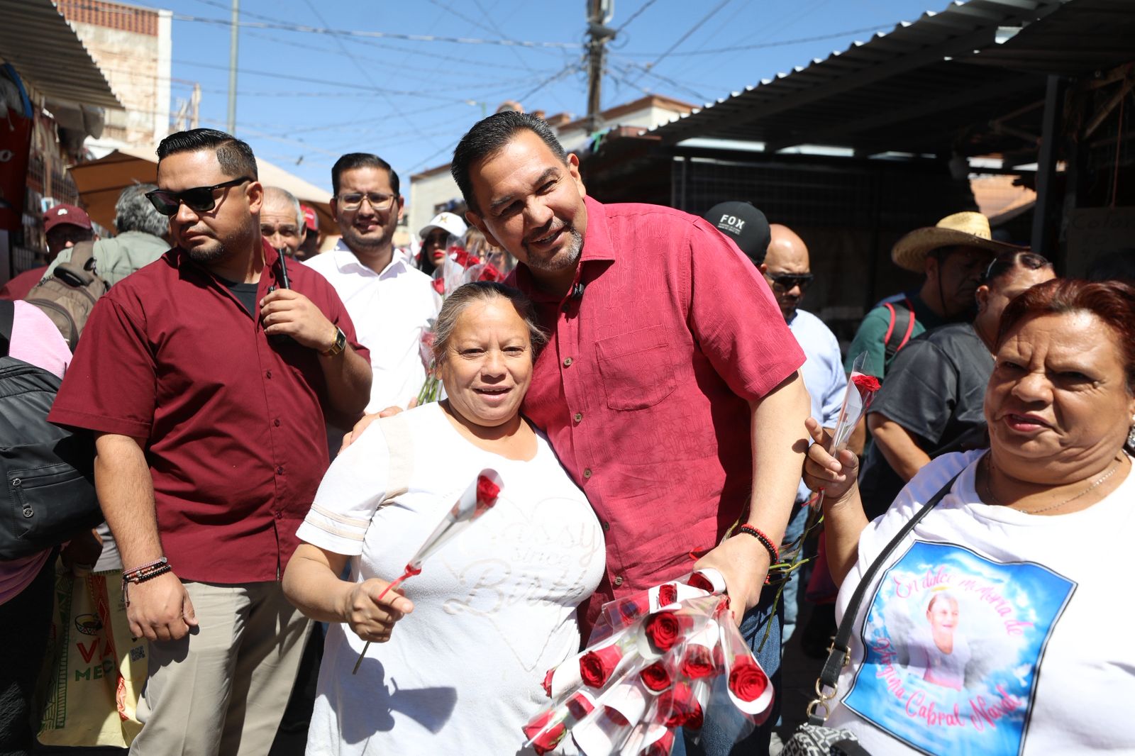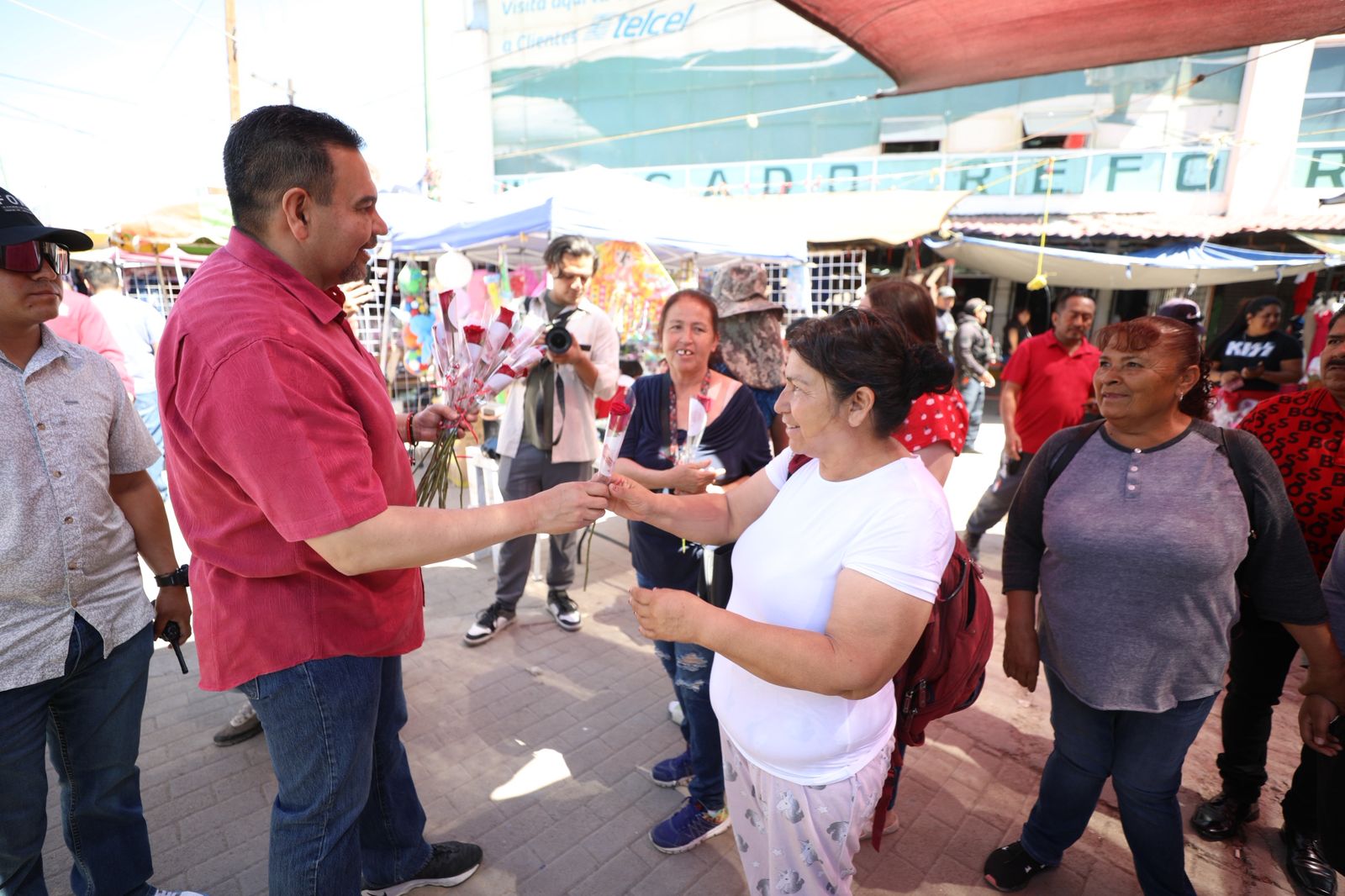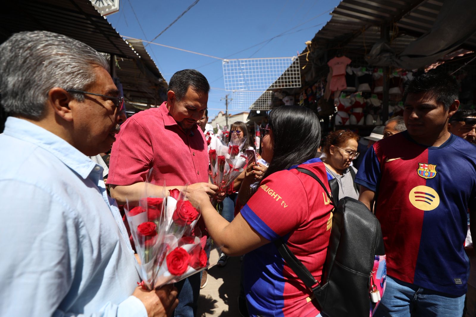 El Presidente Municipal acudió al mercado Cuauhtémoc dónde entregó flores a madres que se encontraban en el lugar y las felicitó por su día, además de tomarse fotos con ellas.