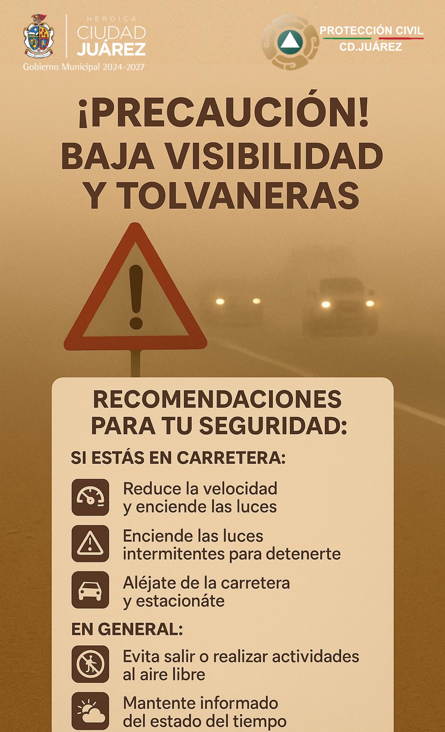 Indicó que se prevé viento de moderado a fuerte intensidad, acompañado de condiciones que podrían generar polvo disperso, tolvaneras y una reducción temporal de visibilidad, que en algunos puntos podría ser inferior a 1.6 kilómetros.