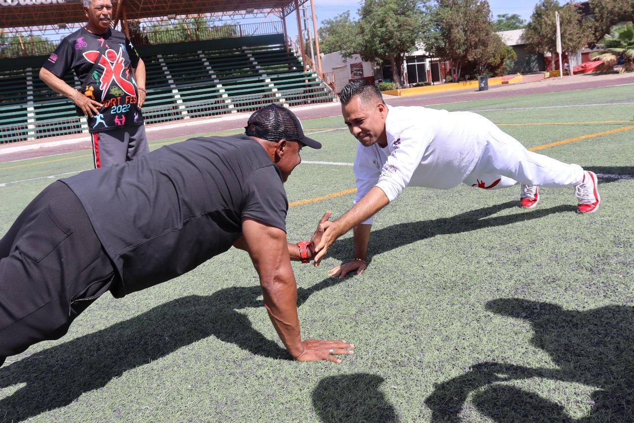 En esta ocasión fue demasiada la adrenalina entre los presentes, quienes iniciaron las retas de lagartijas para pecho entre el comandante Moctezuma de la SSPM; el director del IMDEJ, Juan Escalante y el entrenador de alto rendimiento, Francisco Palacios, dinámica que valió el aplauso y los gritos de los presentes por su favorito.