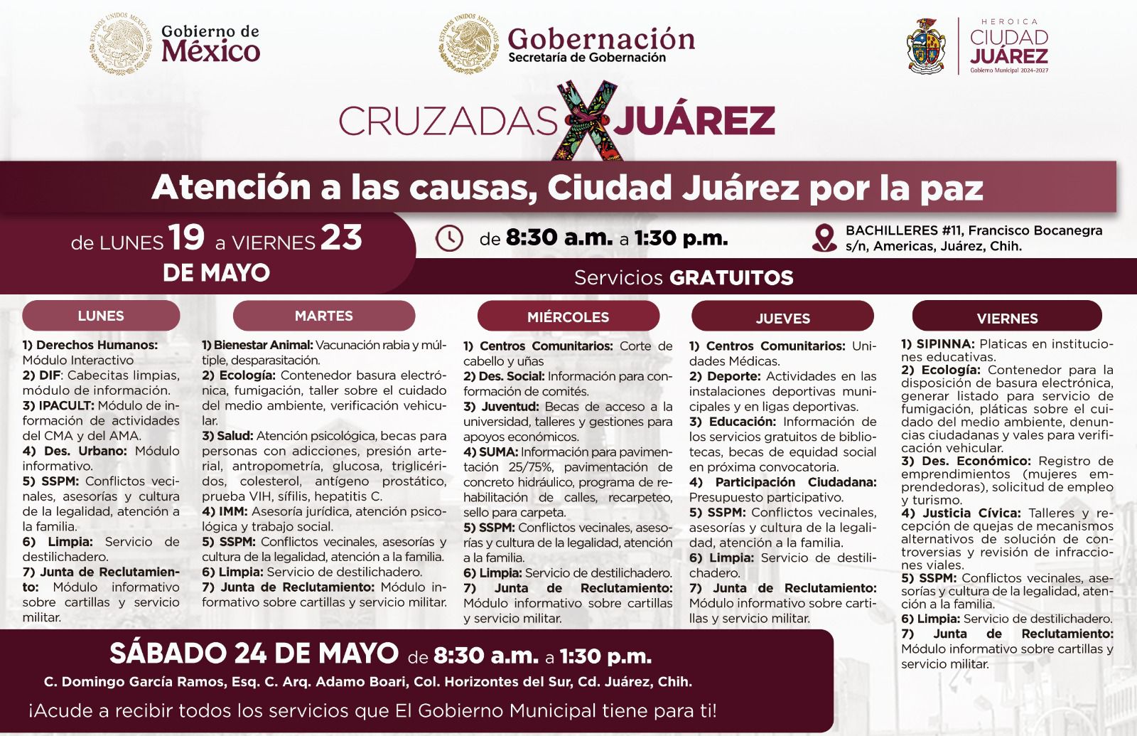 El próximo sábado 24 de mayo de 8:30 de la mañana a 1:30 de la tarde se realizará la Cruzada por Juárez Atención a las causas, Juárez por la Paz, en la calle Domingo García Ramos cruce con la Arq. Adamo Boari, en la colonia Horizontes del Sur.