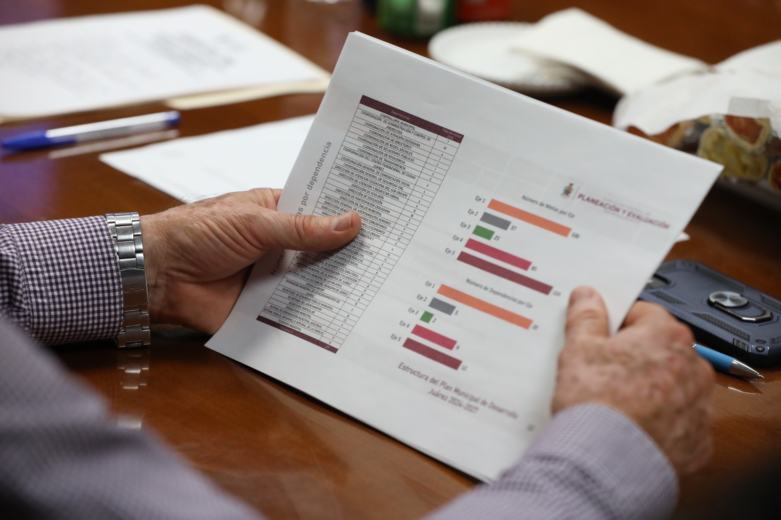 Regidoras de la Comisión Edilicia de Planeación de Desarrollo Municipal se reunieron con el director general de Planeación y Evaluación, Emilio Ramón Ramiro Flores Domínguez, quienes les informó sobre la evaluación del primer trimestre del Plan Municipal de Desarrollo 2025.