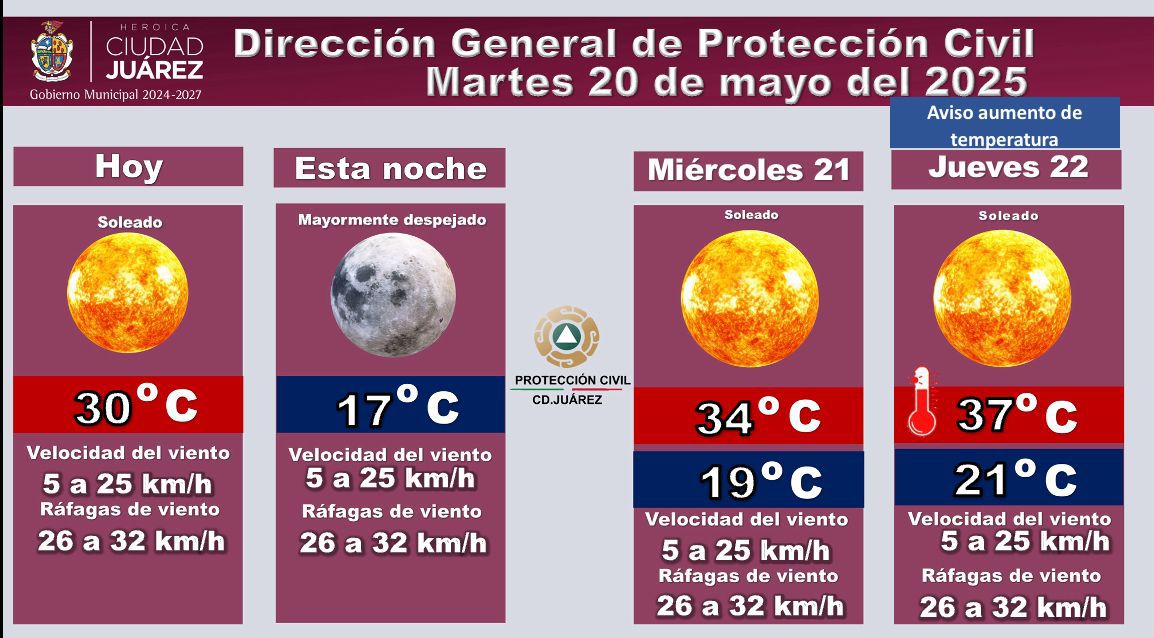 La Dirección General de Protección Civil informa el pronóstico del clima para los próximos días, destacando un aviso por aumento de temperatura a partir del jueves 22.