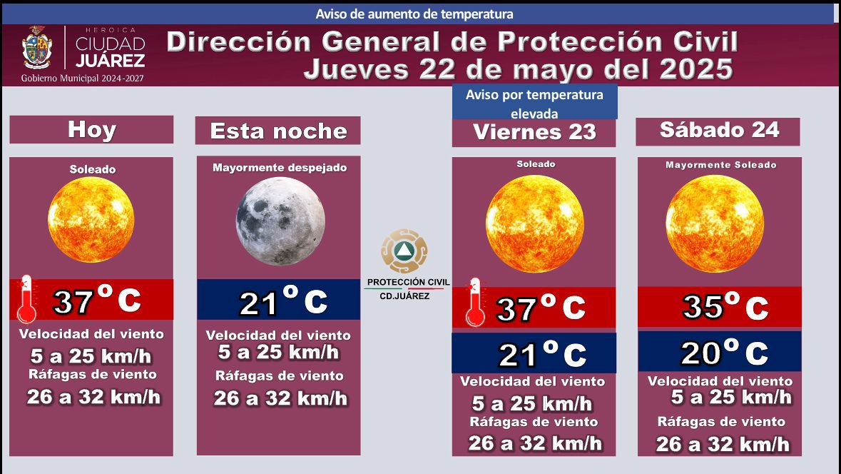 La Dirección General de Protección Civil emitió un aviso por aumento de temperatura para los días jueves 22, viernes 23 y sábado 24 de mayo, destacando condiciones de calor extremo en la región.