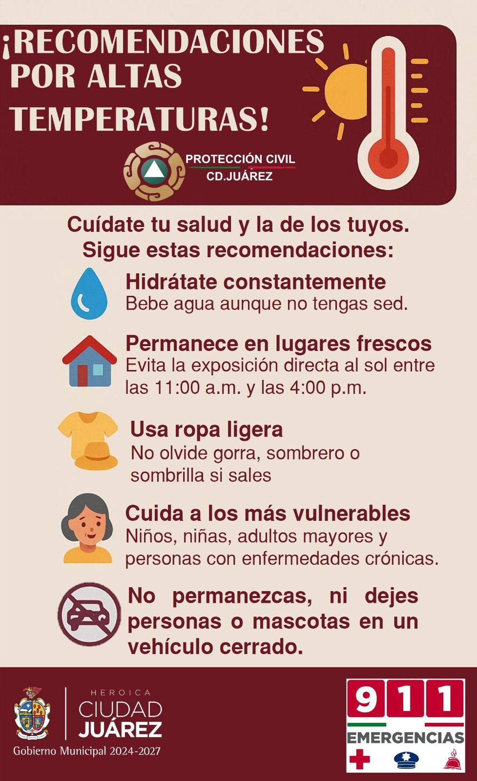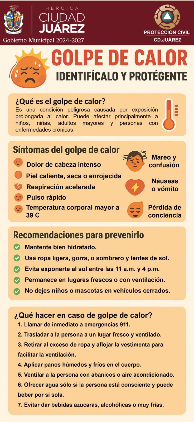 Ante las altas temperaturas que se pronostican para esta ciudad, la Dirección General de Protección Civil emitió una serie de recomendaciones para prevenir golpes de calor y proteger la salud de la población, especialmente de los sectores más vulnerables como niñas, niños, adultos mayores y personas con enfermedades crónicas.