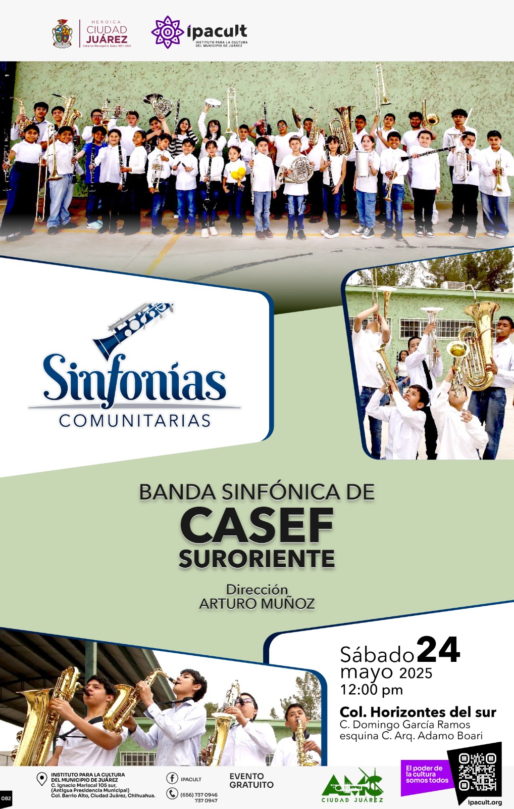 Más tarde, a las 12:00 del mediodia será el turno de la música con la presentación de la Banda Sinfónica Comunitaria de CASEF Suroriente, dirigida por Arturo Muñoz, la cual está integrada por niños y jóvenes de entre 7 y 17 años.