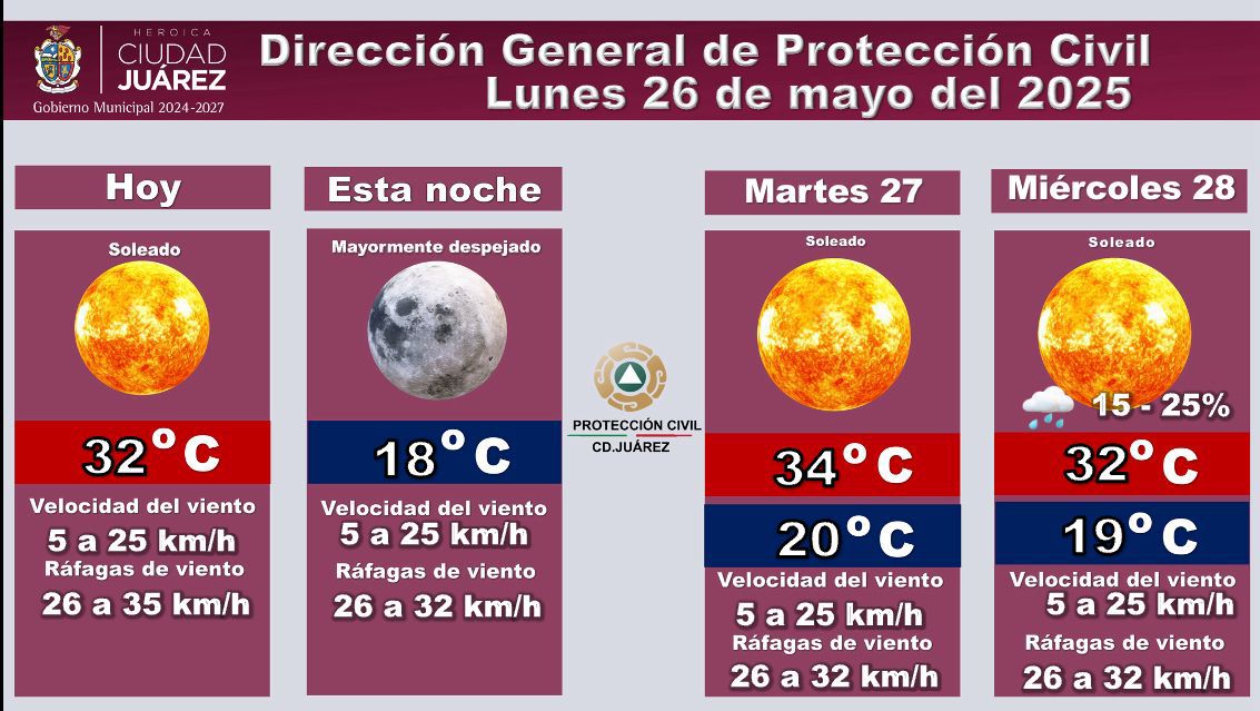 La Dirección General de Protección Civil informa el pronóstico del clima para los días lunes 26, martes 27 y miércoles 28 de mayo.
