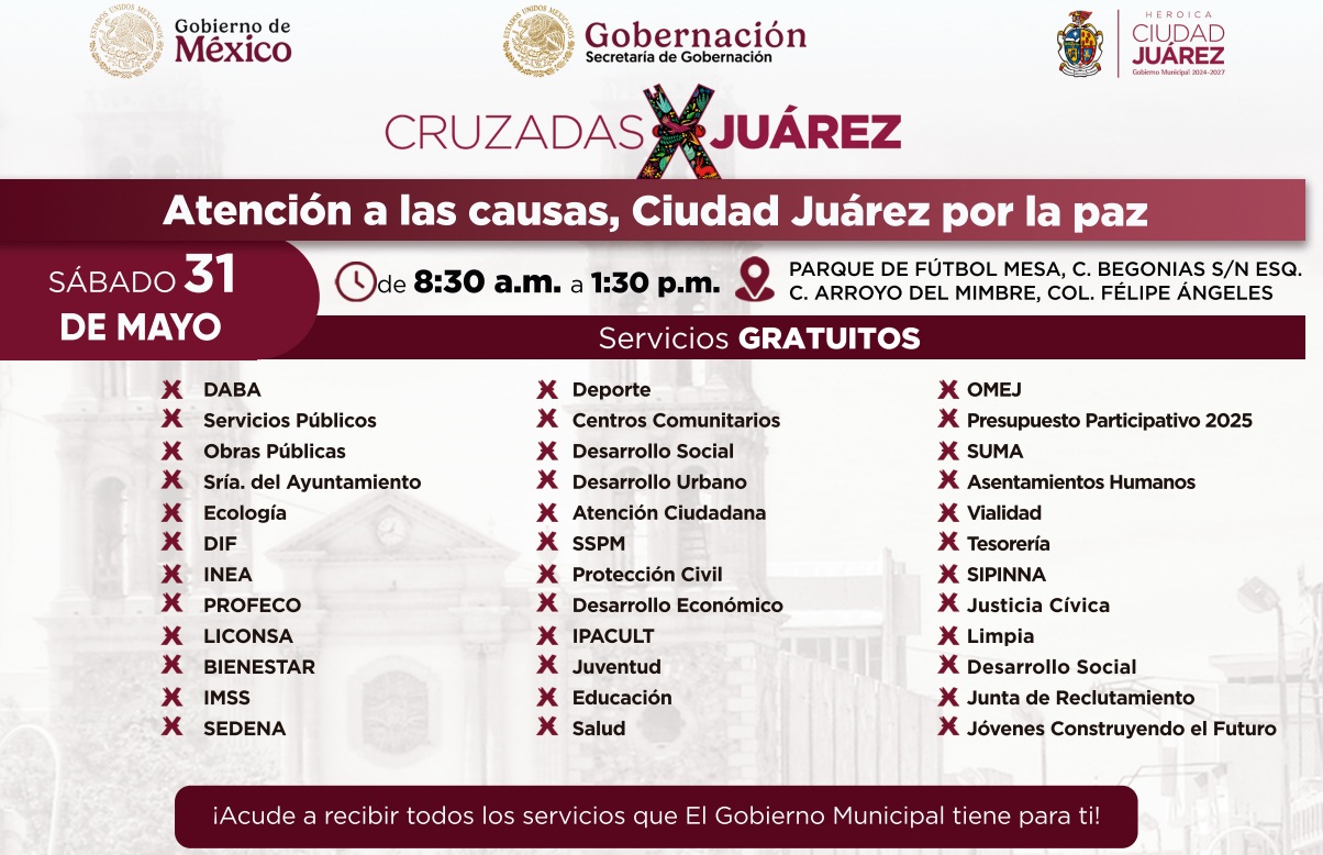 El próximo sábado 31 de mayo, de 8:30 de la mañana a 1:30 de la tarde, se realizará la Cruzada por Juárez Atención a las causas, Juárez por la Paz, en el parque de futbol Mesa, calle Begonias esquina con Arroyo del Mimbre, en la colonia Felipe Ángeles.