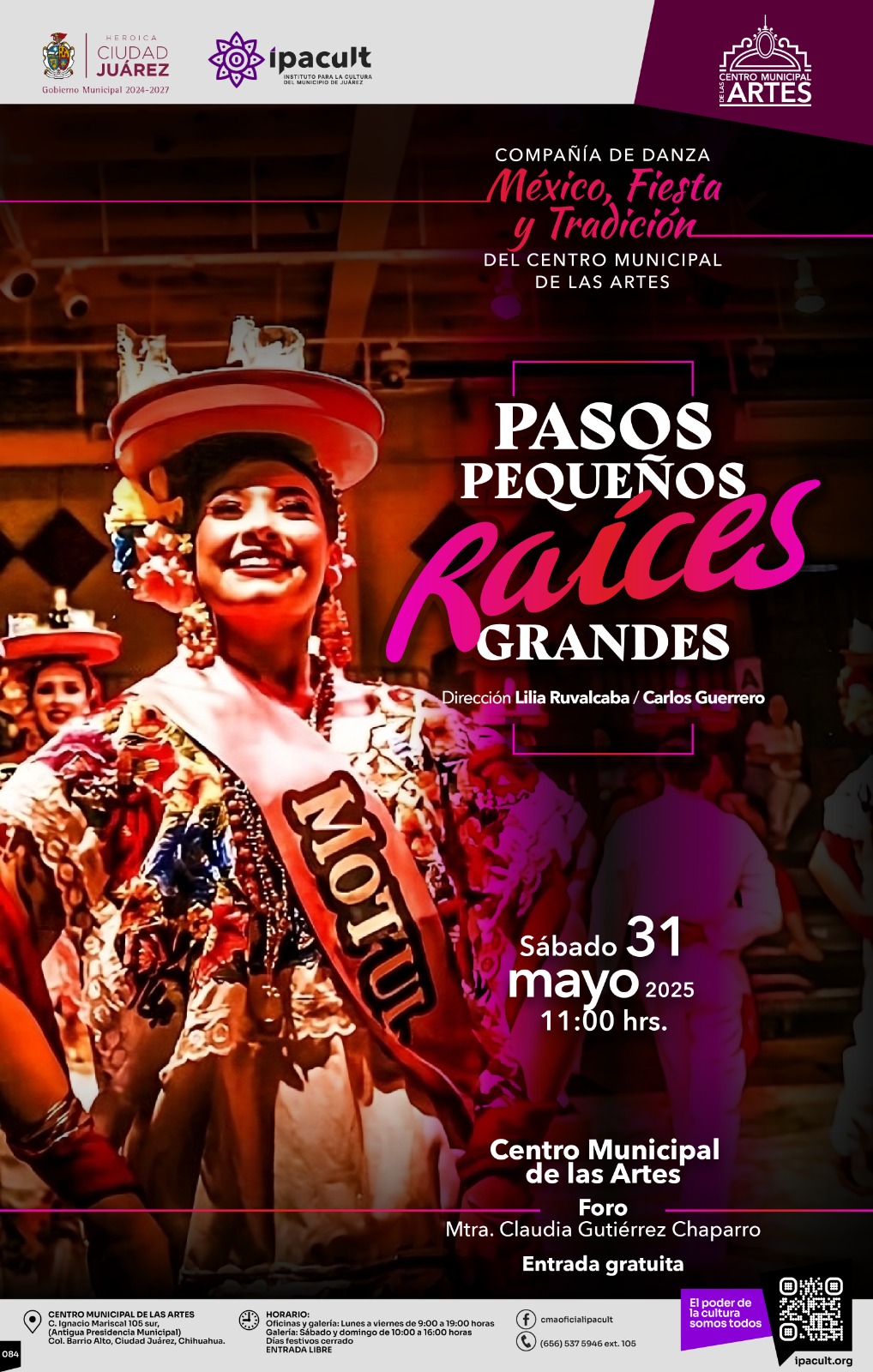 El Instituto para la Cultura del Municipio de Juárez (IPACULT) invita a la ciudadanía para asistir al espectáculo de danza “Pasos pequeños, Raíces grandes”, que se presentará de manera gratuita el próximo sábado 31 de mayo a las 11:00 de la mañana en el Centro Municipal de las Artes (CMA).