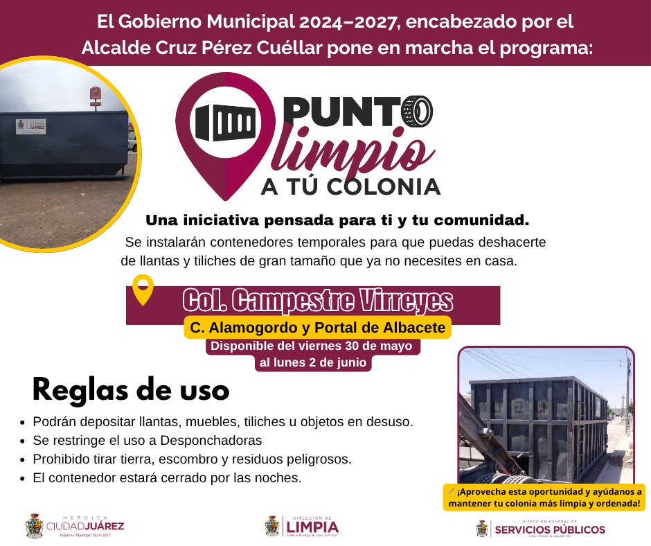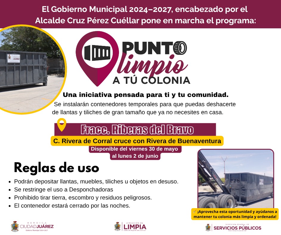 Los contenedores estarán disponibles del viernes 30 de mayo al lunes 2 de junio en las siguientes ubicaciones: colonia Campestre Virreyes, en la calle Camilo Cienfuegos, entre calle Congo y Togo; Riberas del Bravo, calle Rivera de Coral y Rivera de Buenaventura, junto al parque.