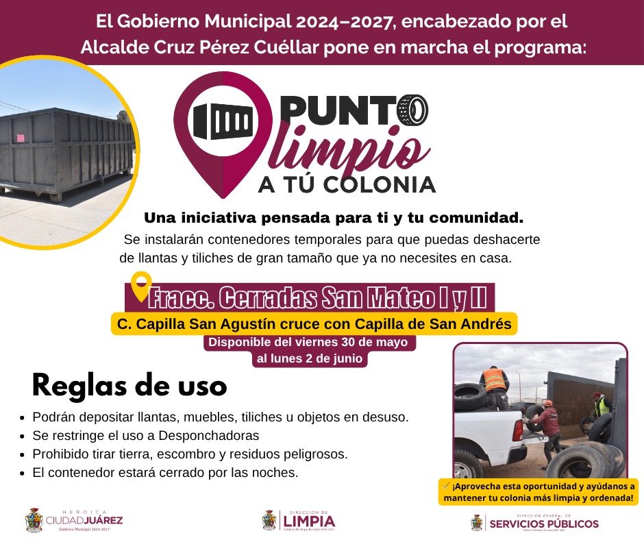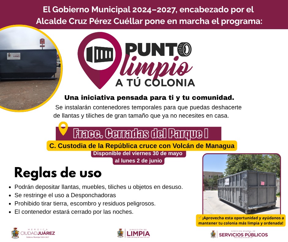 Con el objetivo de seguir combatiendo la acumulación de residuos voluminosos en zonas habitacionales, el Gobierno Municipal, a través de la Dirección de Limpia, continúa este fin de semana con el programa “Punto Limpio a tu Colonia”, que consiste en la colocación de contenedores temporales en distintos fraccionamientos para facilitar a los ciudadanos el depósito de tiliches y llantas.