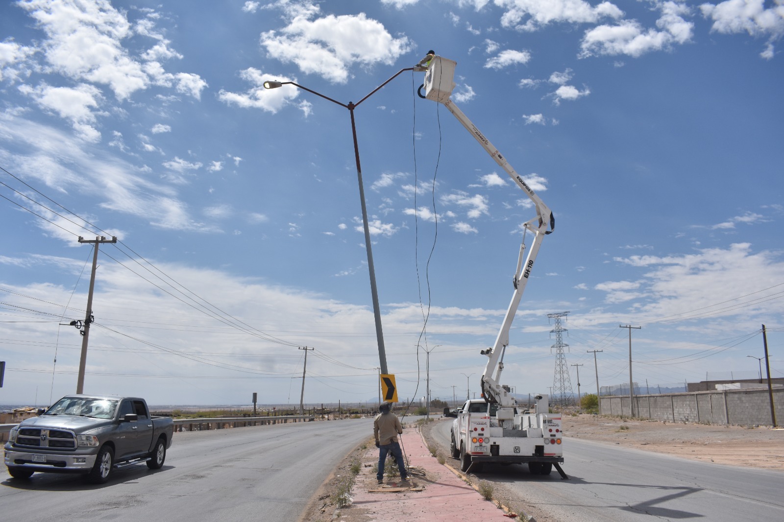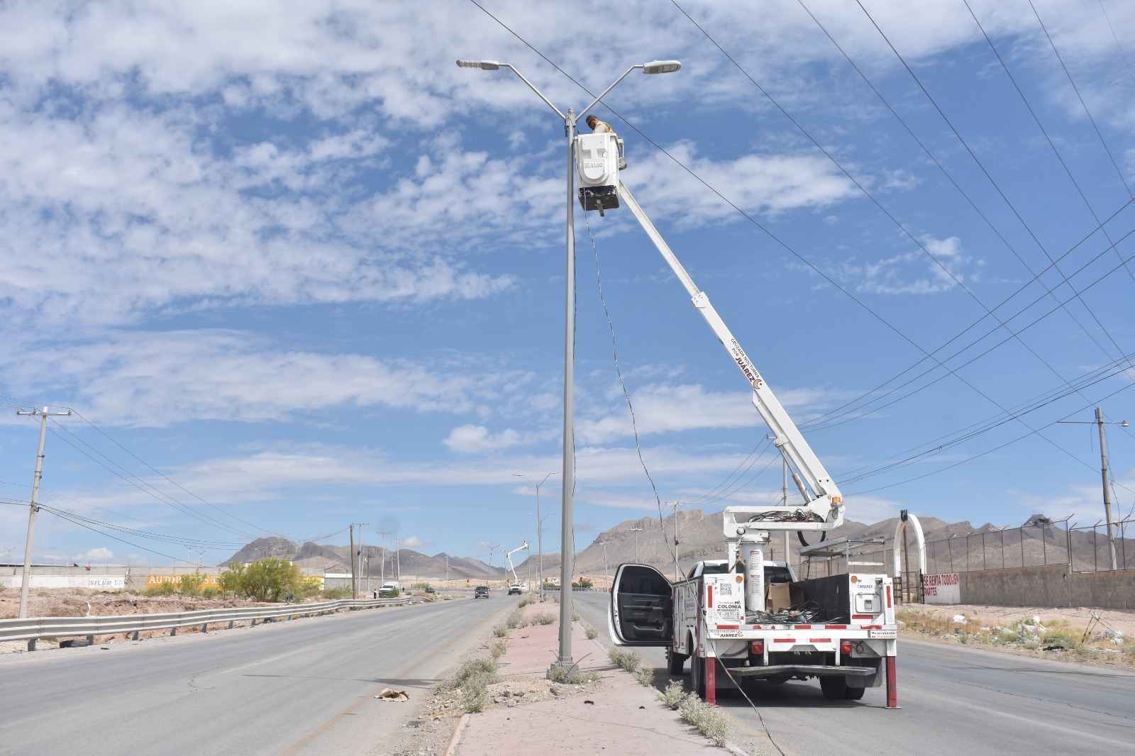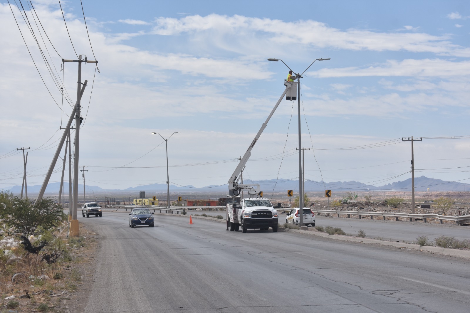 La Dirección de Alumbrado Público continúa con los trabajos de rehabilitación e instalación de infraestructura eléctrica en la carretera a Casas Grandes, una vialidad prioritaria por su alto flujo vehicular y frecuencia de accidentes.
