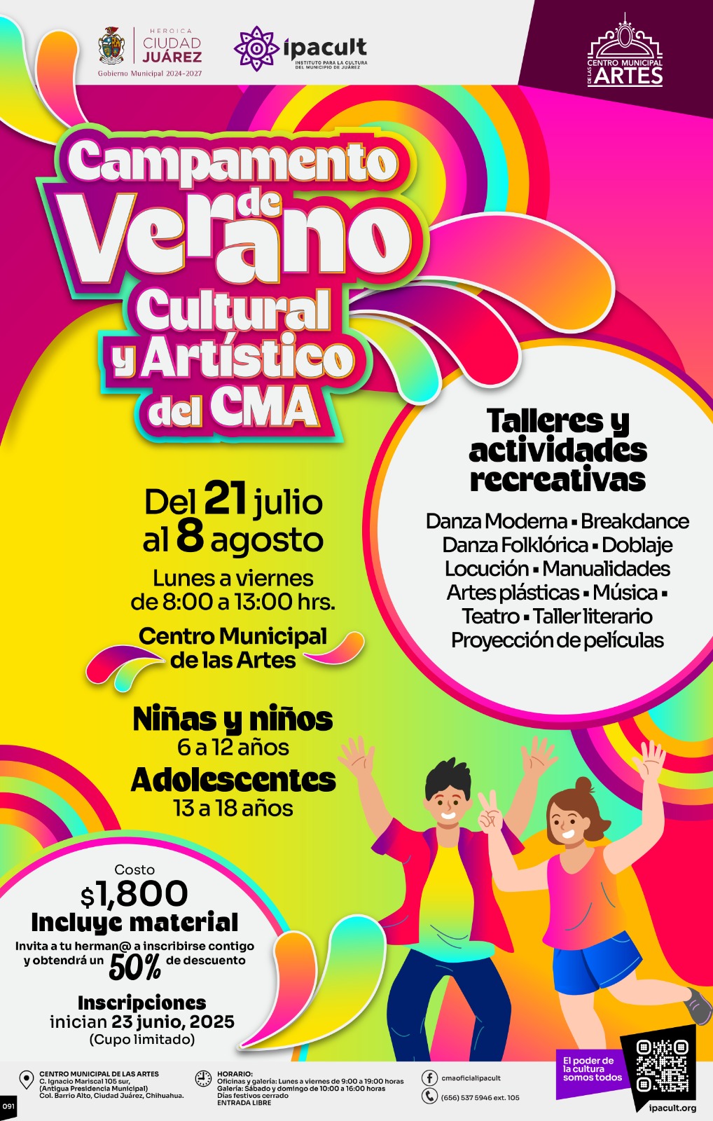 El Instituto para la Cultura del Municipio de Juárez (IPACULT) lanzó la convocatoria para el “Campamento de Verano Cultural y Artístico 2025”, una iniciativa dirigida a niñas, niños y adolescentes que deseen disfrutar de unas vacaciones creativas y formativas.