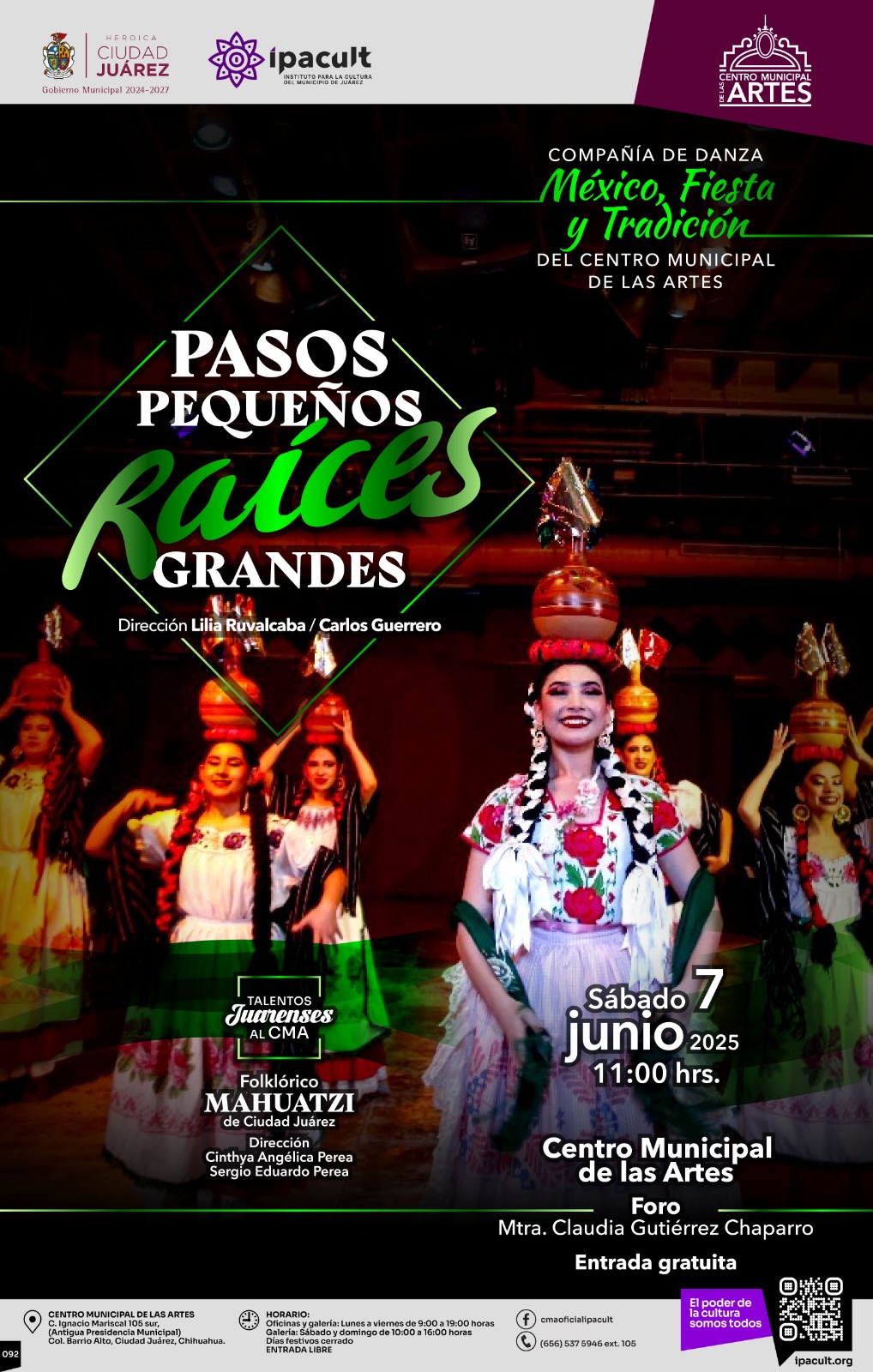 El Instituto para la Cultura del Municipio de Juárez (IPACULT) invita a la comunidad juarense a disfrutar del espectáculo de danza “Pasos pequeños, Raíces grandes”, que se llevará a cabo de manera gratuita este sábado 7 de junio a las 11:00 de la mañana en el Centro Municipal de las Artes (CMA).