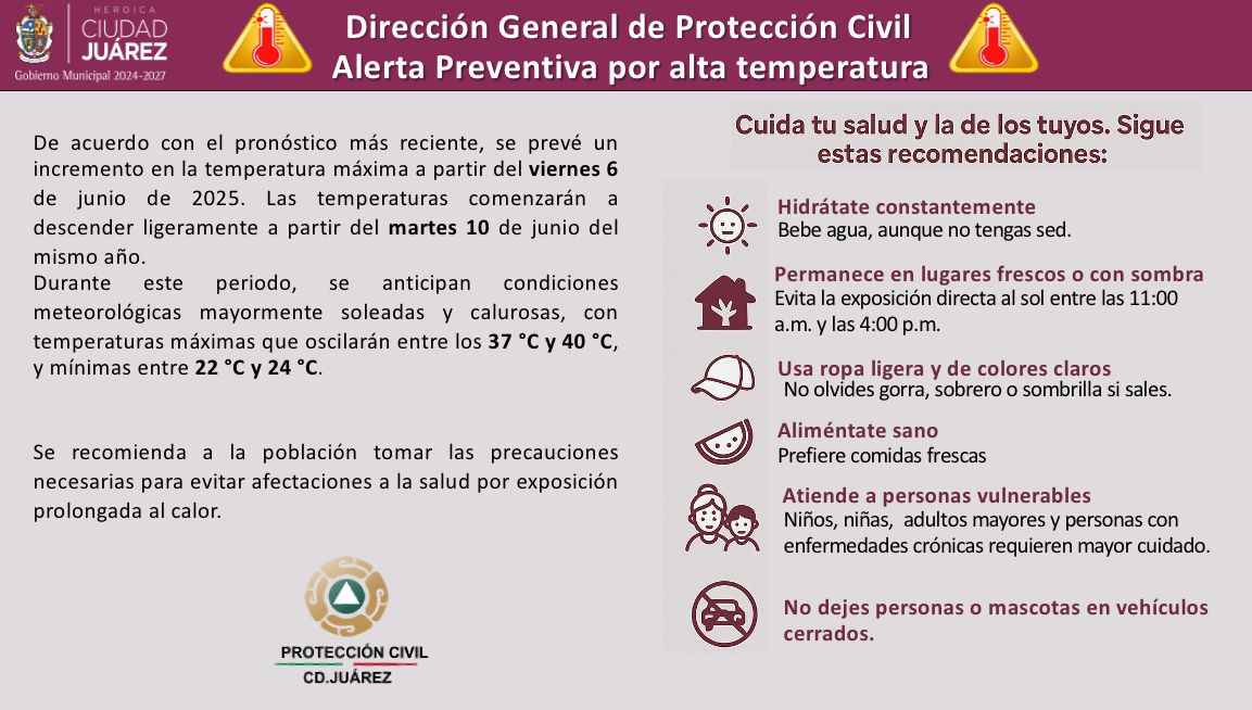La Dirección General de Protección Civil del Gobierno Municipal emitió una alerta preventiva por altas temperaturas, con base en el pronóstico más reciente que indica un incremento en la temperatura máxima a partir de mañana viernes 6 de junio.