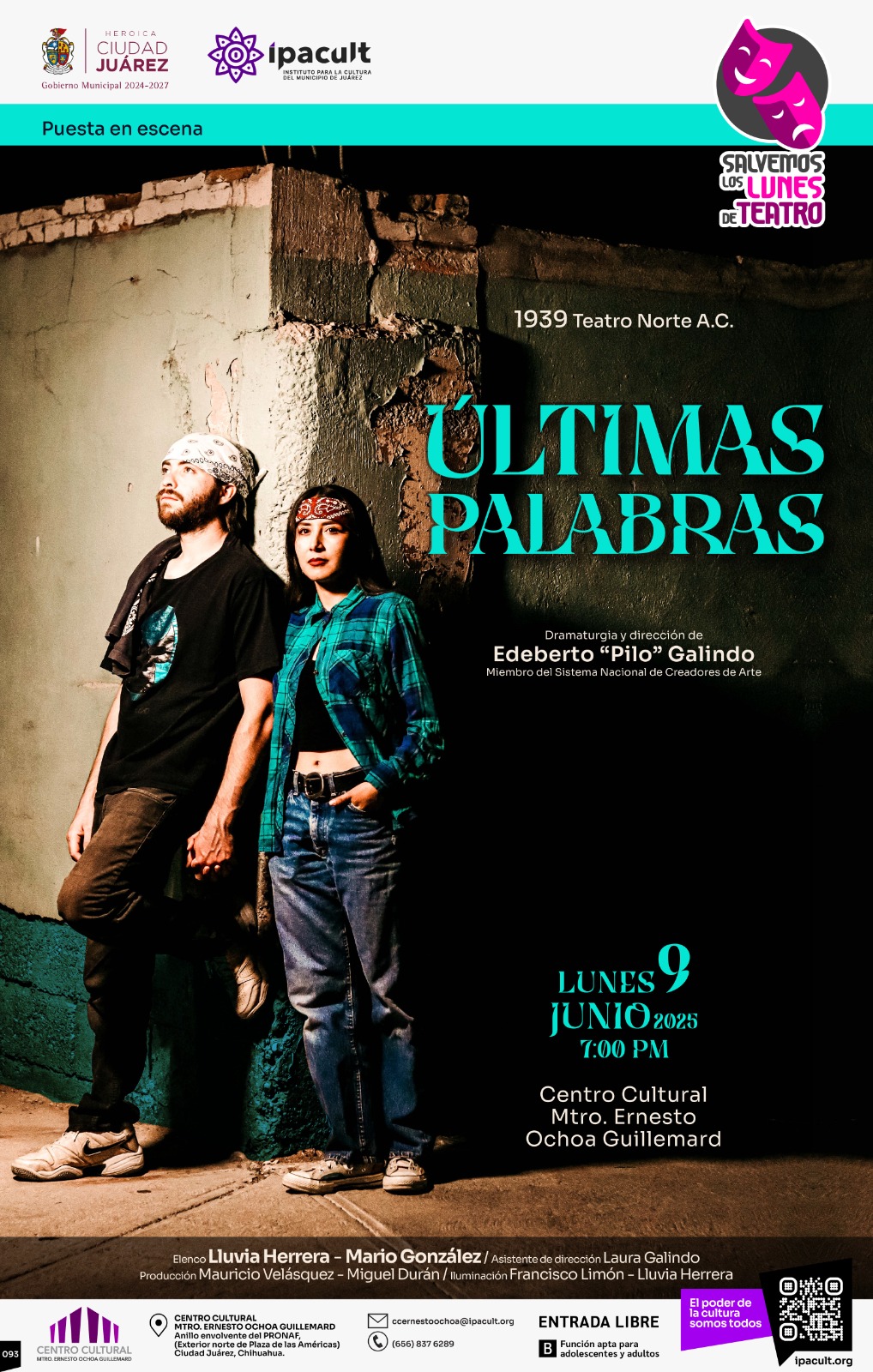 El Instituto para la Cultura del Municipio de Juárez (IPACULT) invita a la comunidad a disfrutar de la puesta en escena “Últimas Palabras”, obra escrita y dirigida por el dramaturgo local Edeberto “Pilo” Galindo, que se presentará este lunes 9 de junio a las 7:00 de la tarde en el Centro Cultural Ernesto Ochoa Guillemard.