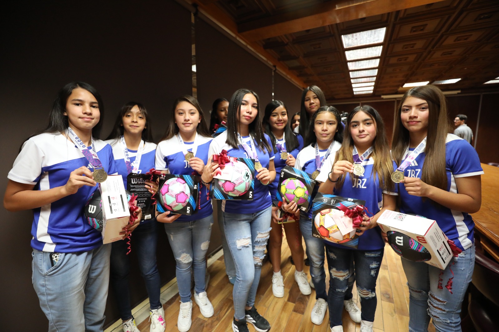 La tarde de este viernes, el Presidente Municipal, Cruz Pérez Cuéllar, recibió a la selección femenil de secundarias de Ciudad Juárez que ganó en el torneo estatal de futbol, por lo que parte de ellas representarán al estado de Chihuahua en el torneo nacional que se celebrará en Puebla.