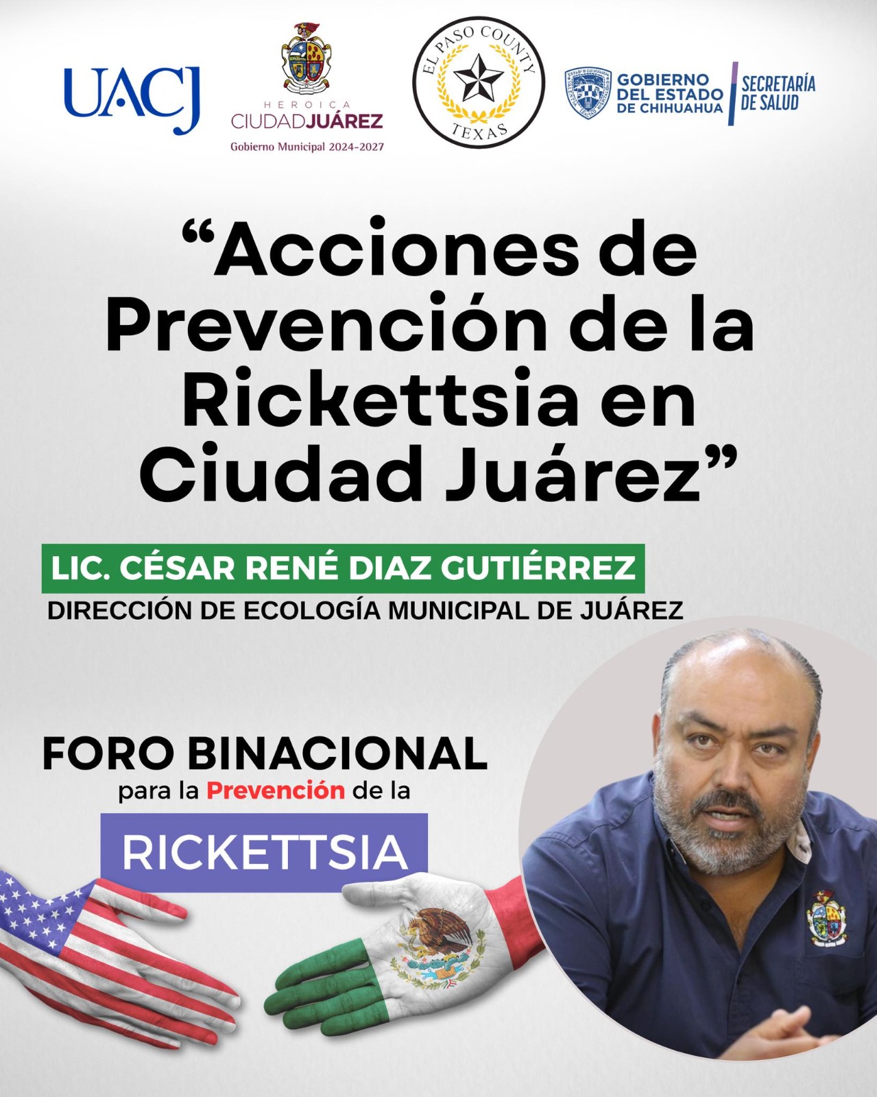 Otros ponentes serán Álvaro Medina, del Departamento de Bienestar Animal del Condado de El Paso, con el tema “Rickettsia, Actividades Binacionales para su Prevención”; Angélica Escárcega Ávila, de la Universidad Autónoma de Ciudad Juárez (UACJ), con la ponencia “Avances y Desafíos en el Estudio de Rickettsiosis en Zonas Endémicas”, además de Manuel Brito Hernández, de la UACJ, con la ponencia “Repercusión de la Rickettsia Rickettsii en la Salud Humana”.