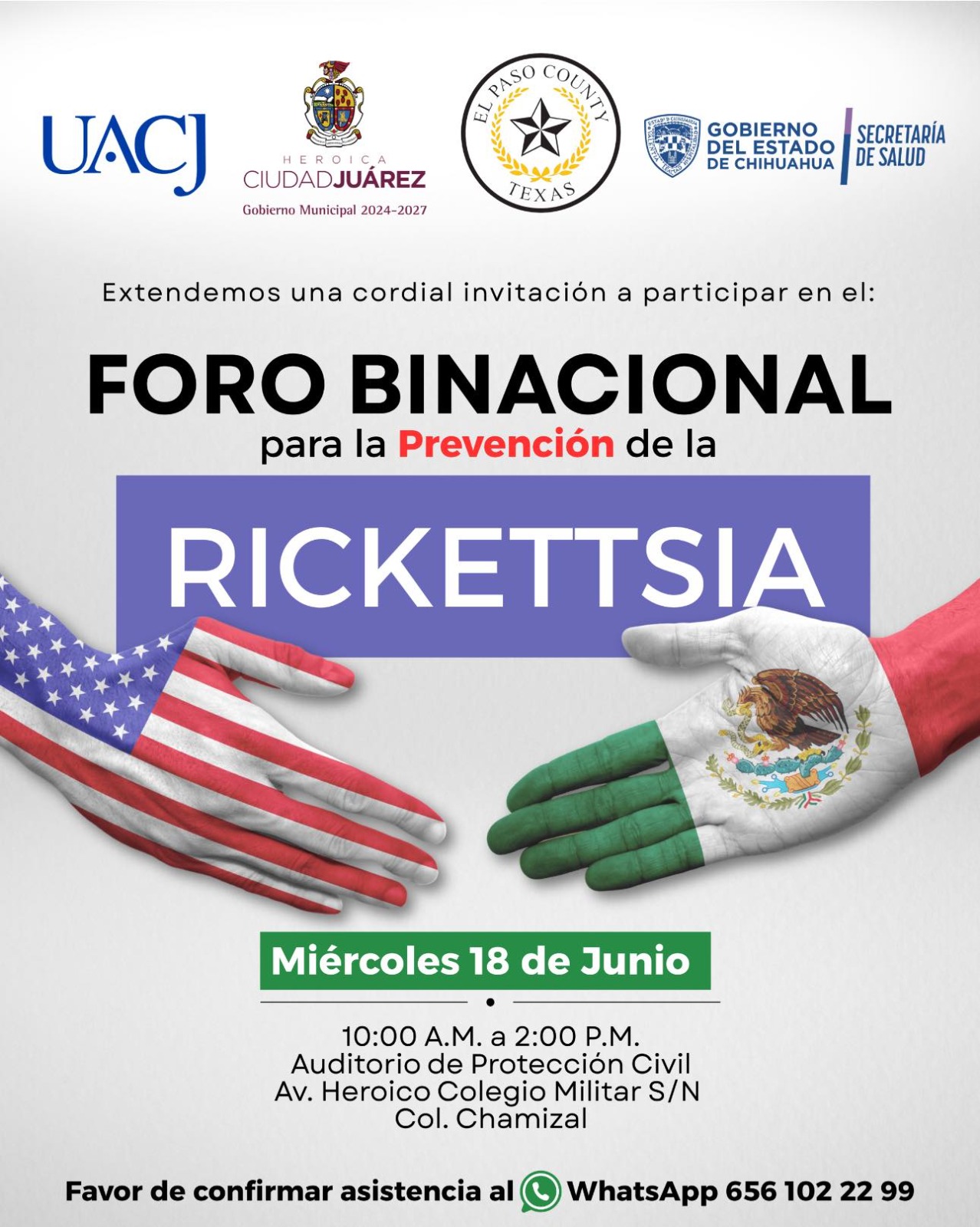 El Foro Binacional para la Prevención de la Rickettsia tendrá un horario de 10:00 de la mañana 2:00 de la tarde. Quienes deseen acudir deben confirmar asistencia en la aplicación WhatsApp al número de teléfono 656-102-2299.