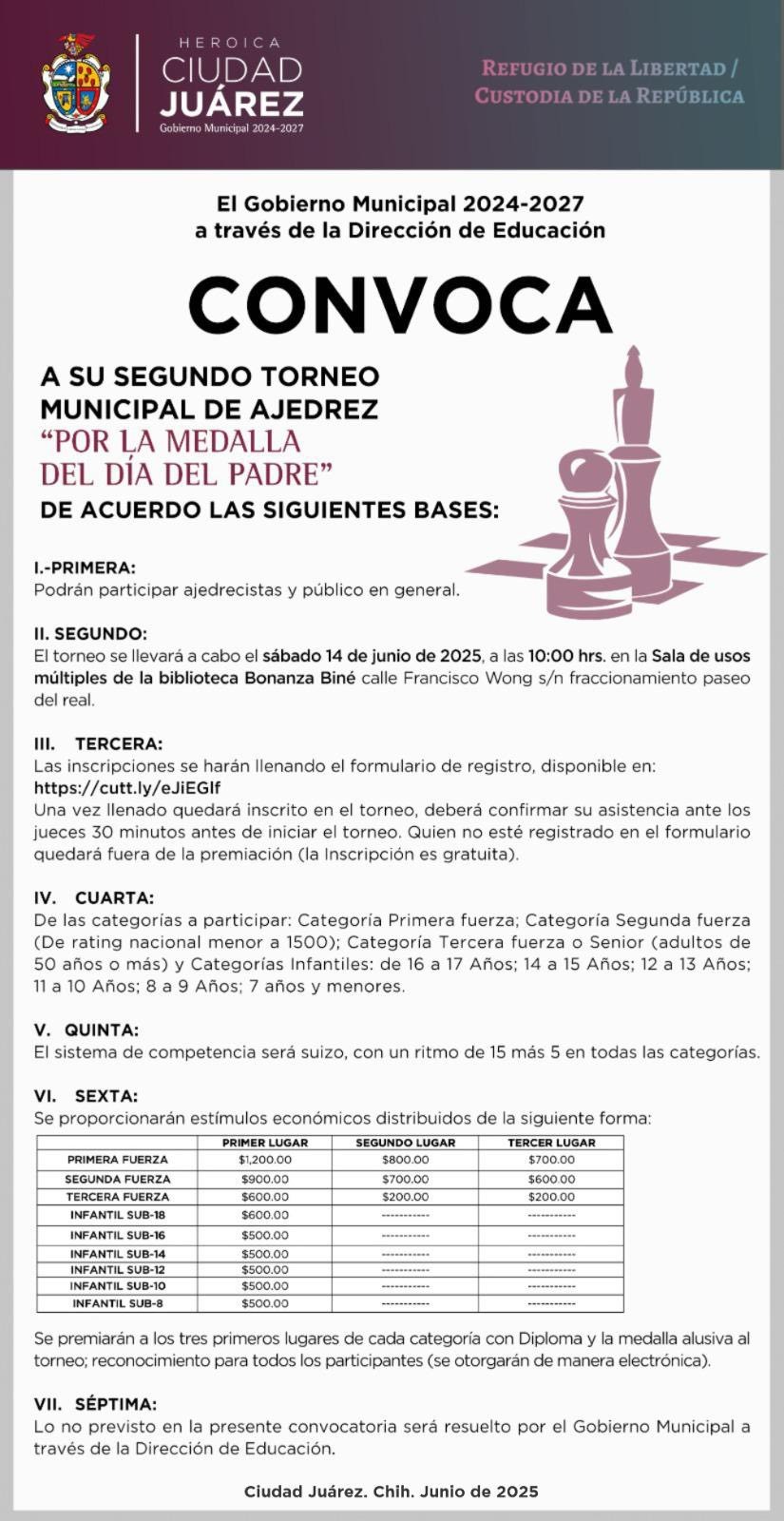 La Dirección de Educación convoca al Segundo Torneo Municipal de Ajedrez “Por la medalla del Día del Padre”.