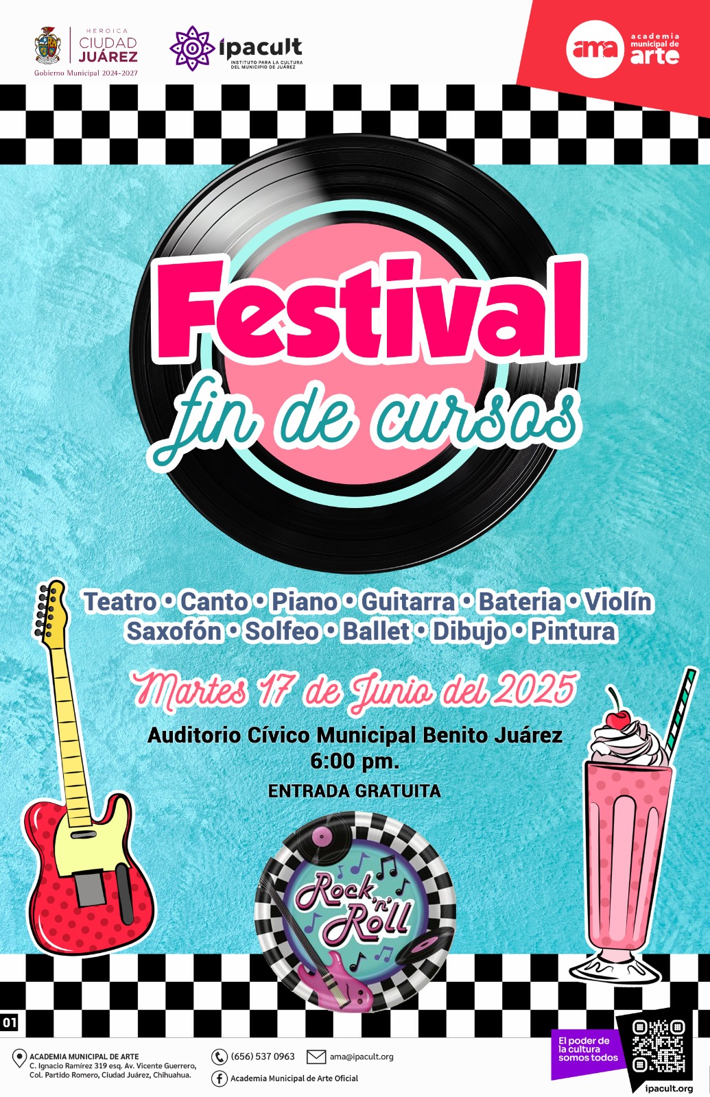 El Instituto para la Cultura del Municipio de Juárez (IPACULT) invita cordialmente a la ciudadanía a asistir al Festival de Fin de Cursos de la Academia Municipal de Arte (AMA), que se celebrará este martes 17 de junio a las 6:00 de la tarde en el Auditorio Cívico Municipal Benito Juárez.