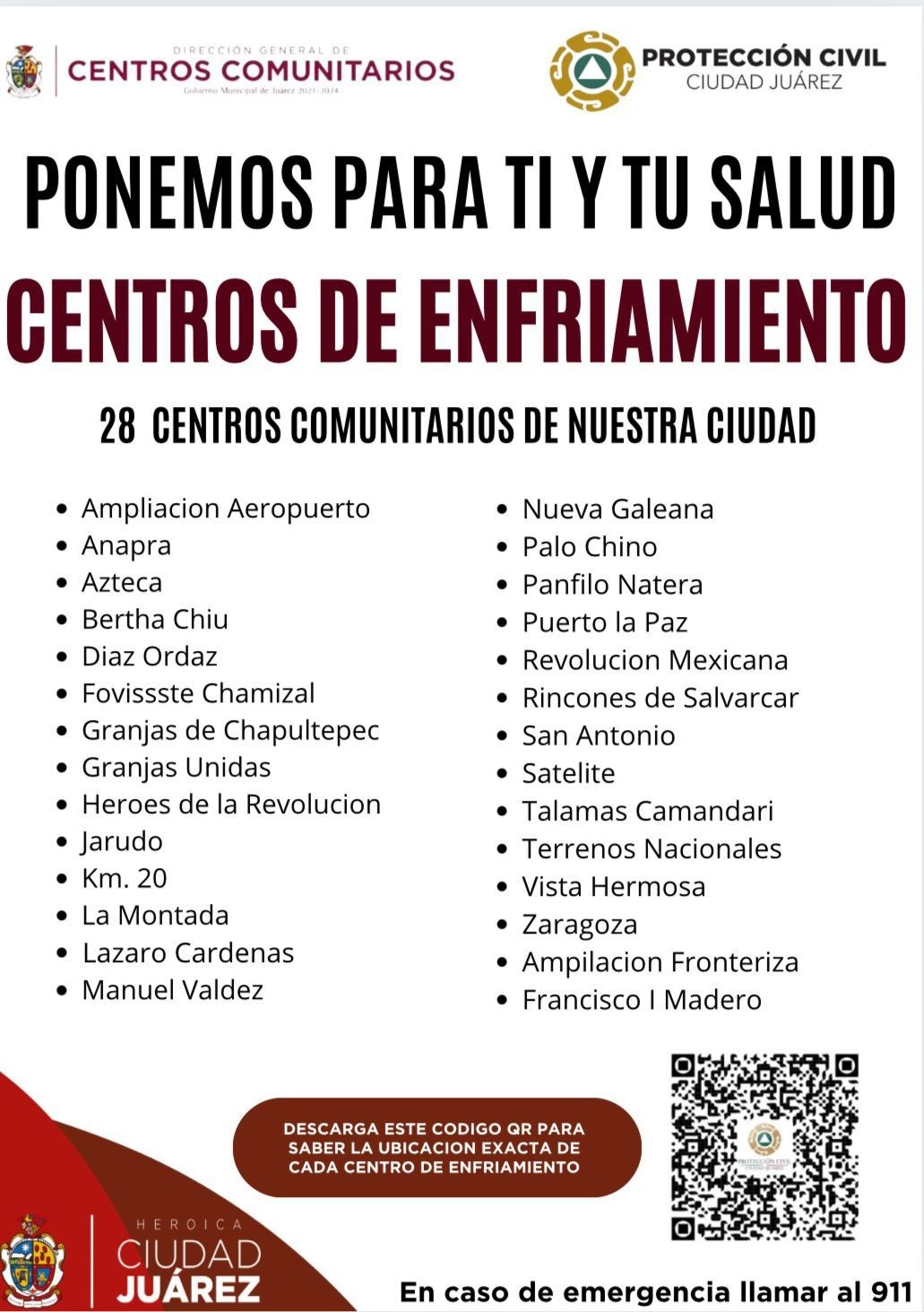 Los centros de enfriamiento se encuentran ubicados en los siguientes los comunitarios: Ampliación Aeropuerto, Anapra, Azteca, Bertha Chiu, Díaz Ordaz, Fovissste Chamizal, Granjas de Chapultepec, Granjas Unidas, Héroes de la Revolución, Jarudo, Kilómetro 20 y La Montada.