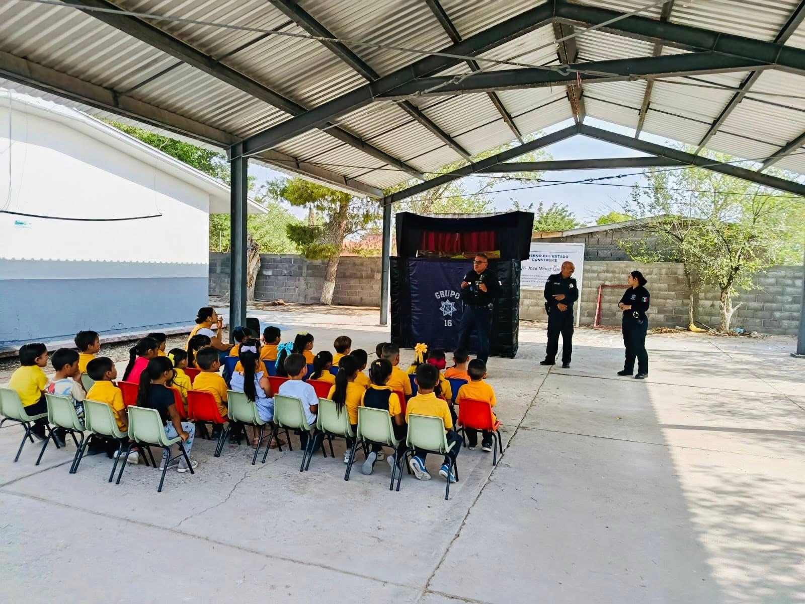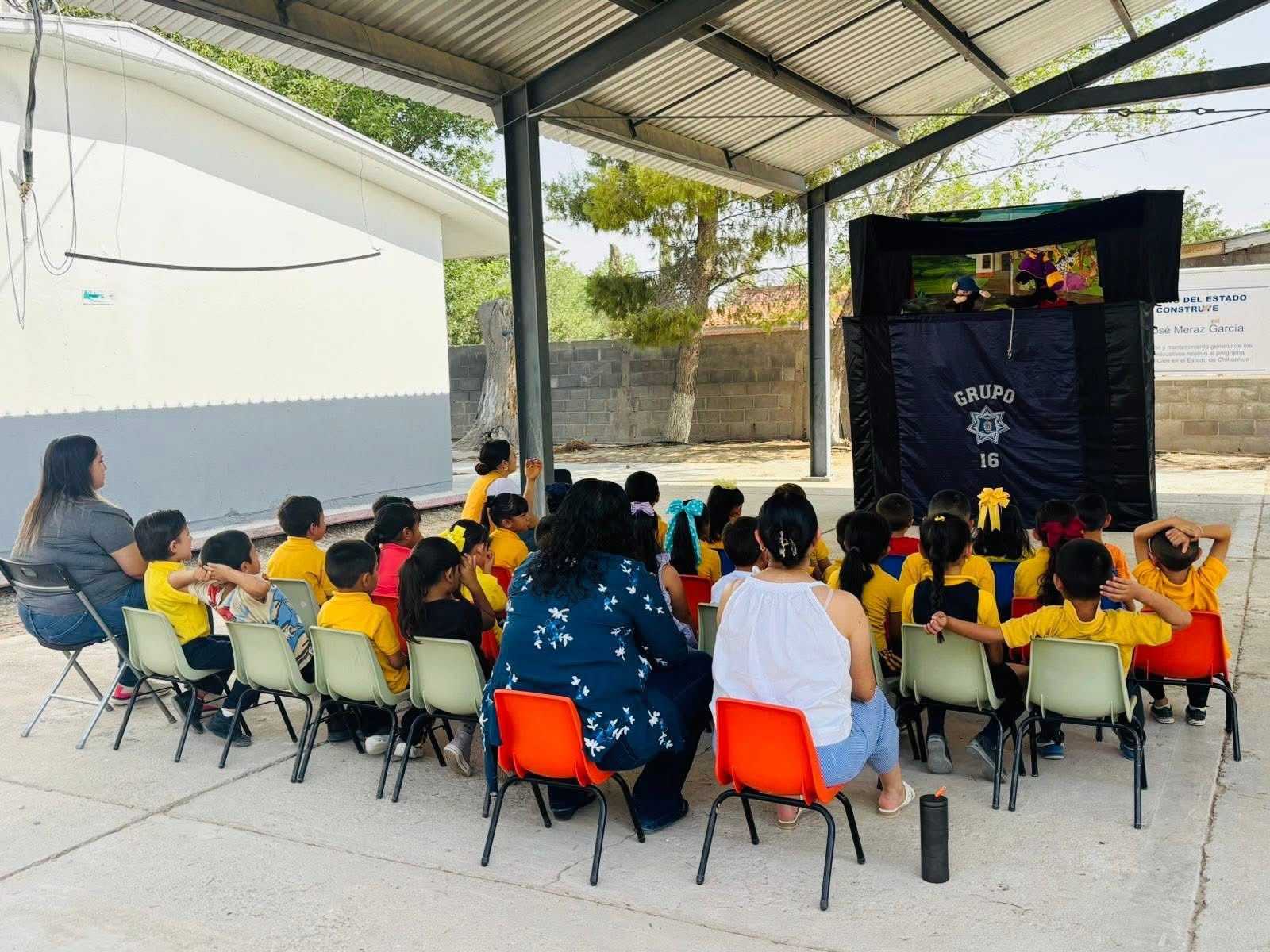 Elementos de la Dirección de Prevención Social de la Secretaría de Seguridad Pública Municipal, se dieron cita en el ejido Samalayuca para presentar el Teatro Guiñol a las y los alumnos del Jardín de niños José Meraz García, así como a los docentes.