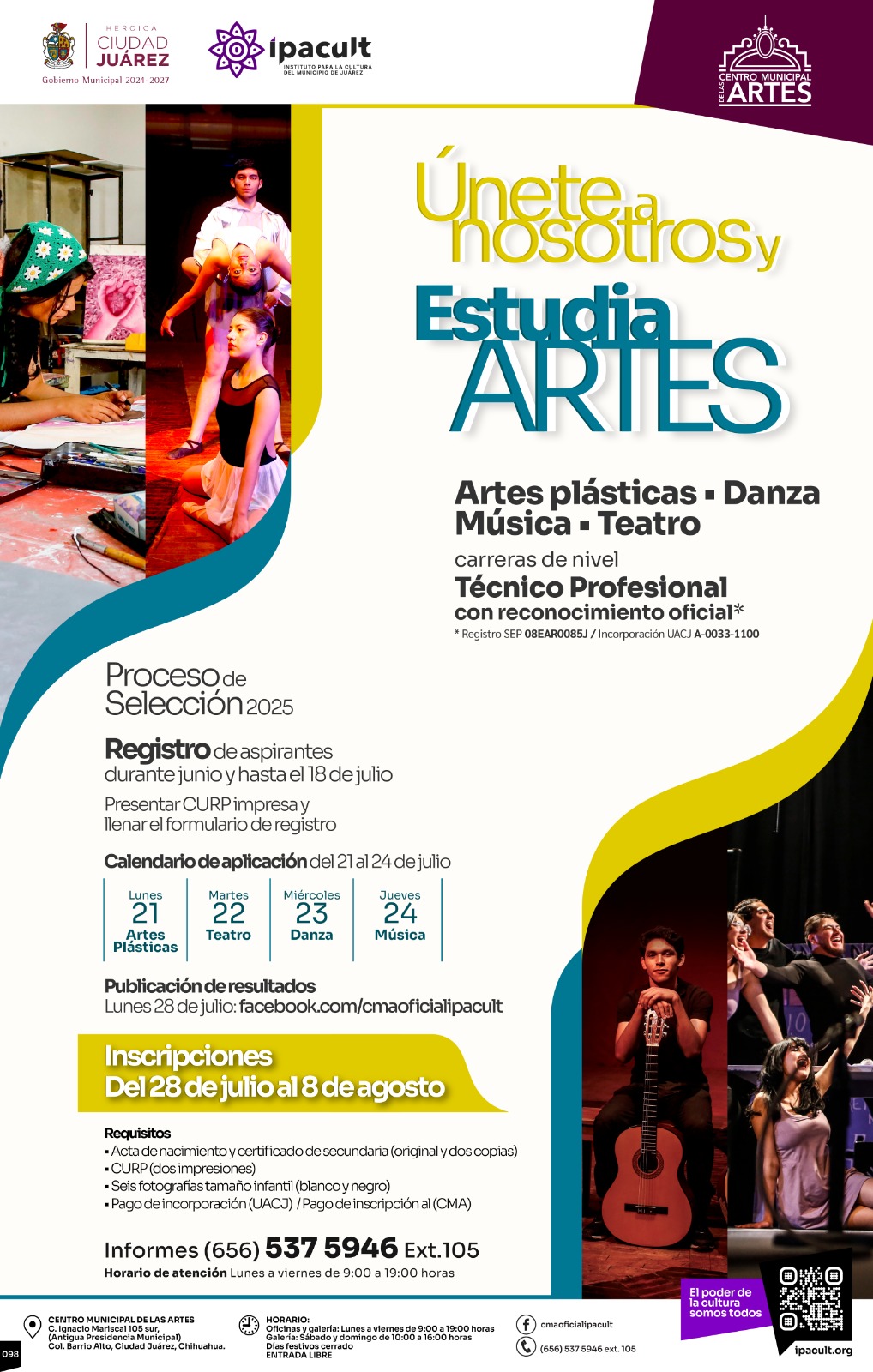 El Instituto para la Cultura del Municipio de Juárez (IPACULT) invita a la ciudadanía a inscribirse en las carreras técnico-profesionales que ofrece el Centro Municipal de las Artes (CMA) en las disciplinas de música, danza, teatro y artes plásticas.