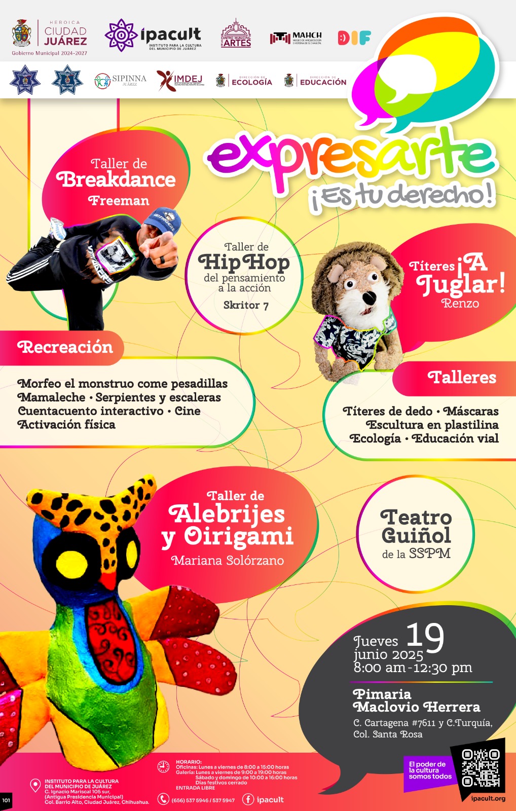 Con el apoyo del Sistema Municipal de Protección Integral de Niñas, Niños y Adolescentes (SIPINNA Juárez), “Expresarte ¡es tu derecho!” ofrecerá actividades como canto, creación de máscaras, alebrijes, origami, títeres de dedo, escultura en plastilina y educación vial, todo con un enfoque participativo y pedagógico.