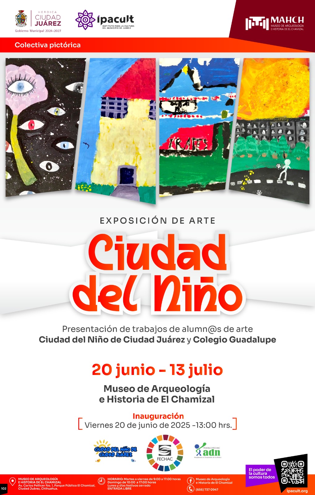 El Instituto para la Cultura del Municipio de Juárez (IPACULT) hace una cordial invitación a toda la ciudadanía a la inauguración de la exposición de arte “Ciudad del Niño”, que se llevará a cabo este viernes 20 de junio a la 1:00 de la tarde en el Museo de Arqueología e Historia de El Chamizal (MAHCH).