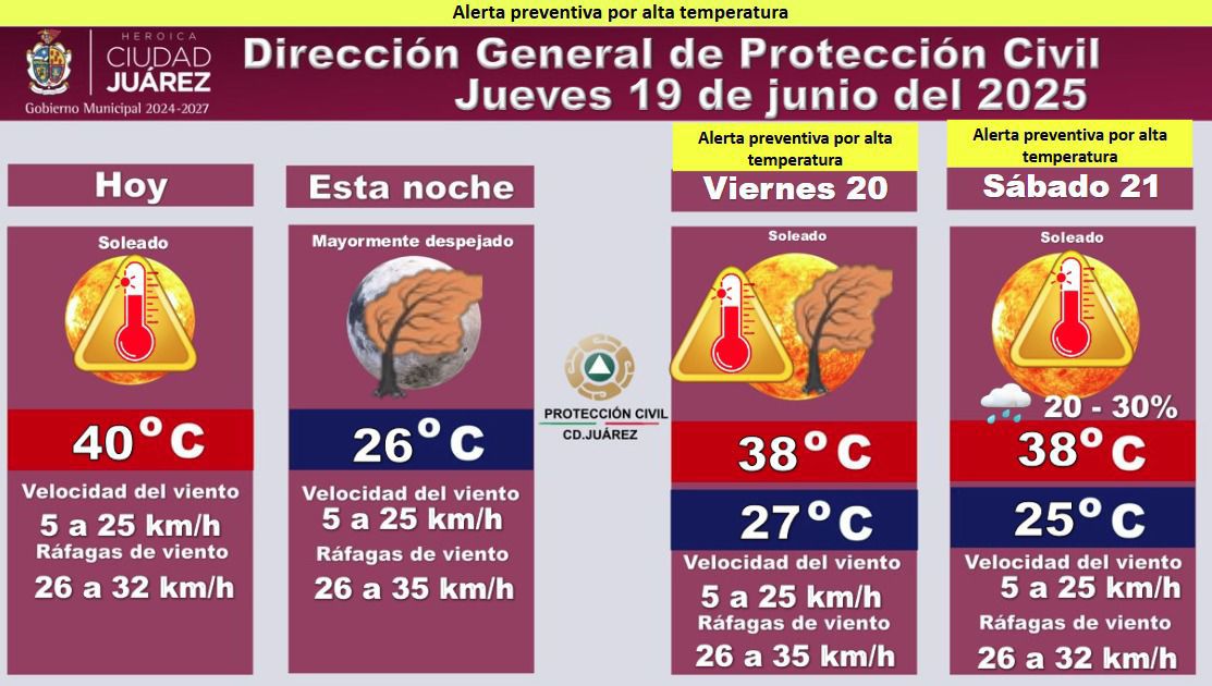 La Dirección General de Protección Civil emitió una alerta preventiva por alta temperatura para este jueves 19, mañana viernes 20 y el sábado 21, ante el pronóstico de temperaturas extremas en la región.
